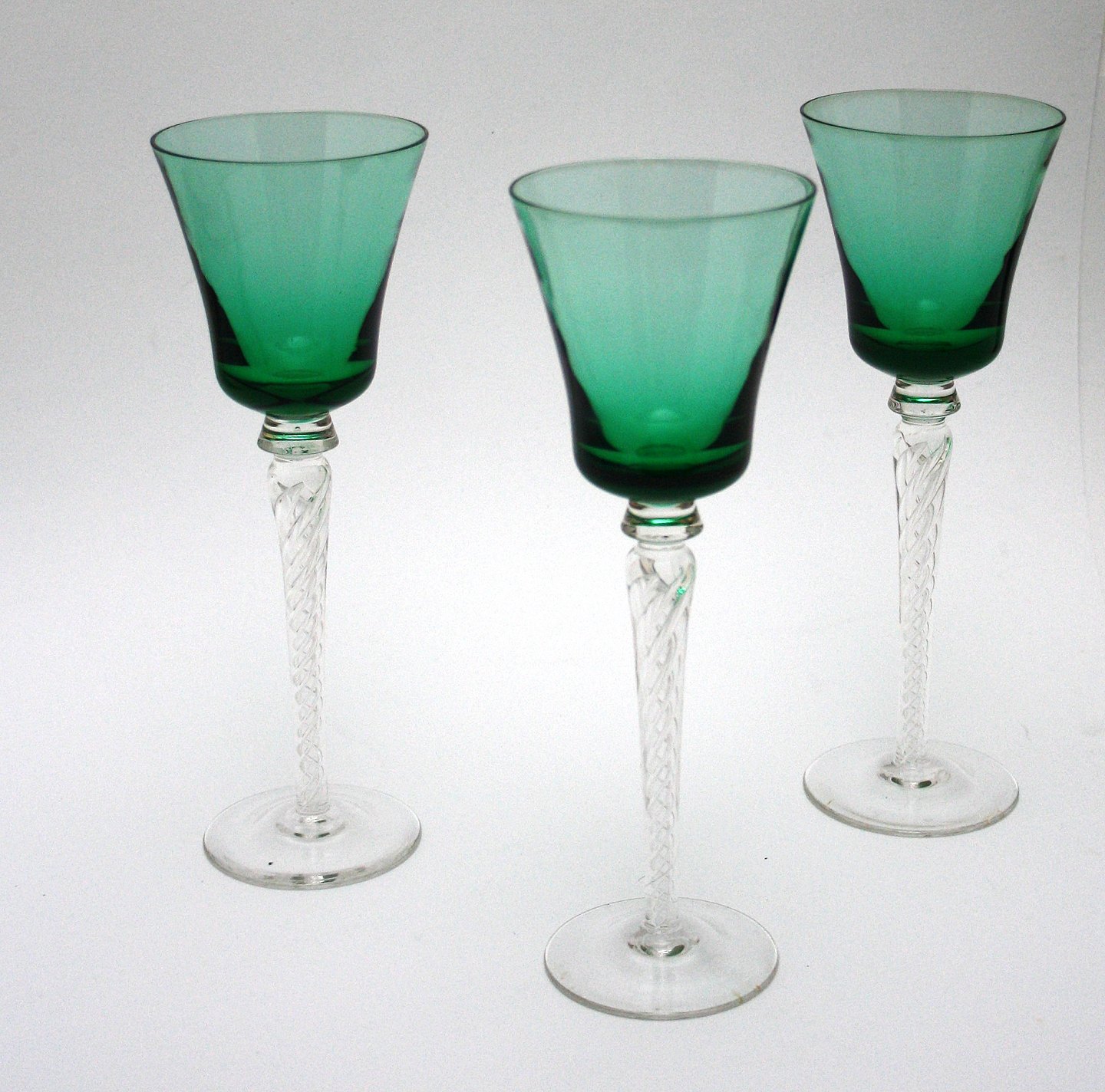 Vinglas med grøn kumme og indvendig snoning. Højde 22 cm. Øverste diameter 7,8 cm. Pris: 200 kr. stk. Lager: 1