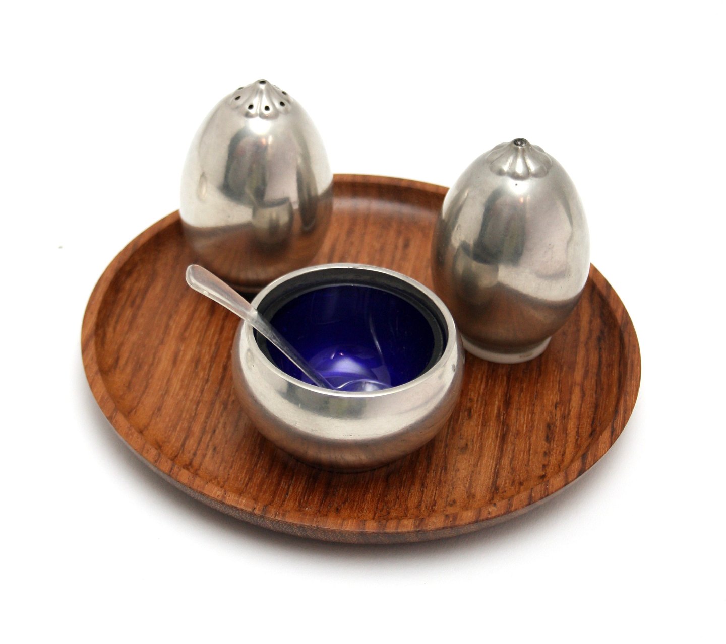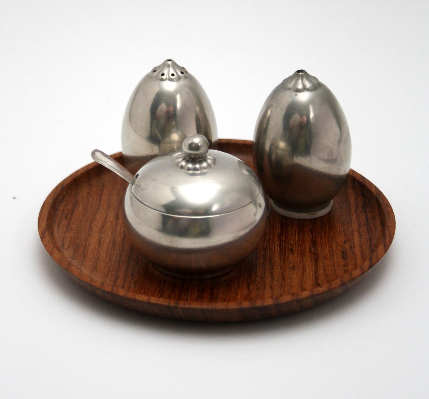 Just Andersen, Plat de menage i poleret tin bestående af salt, peber, sennep med blå glasindsats og plastske, samt træbakke. Flot stand. Pris: SOLGT