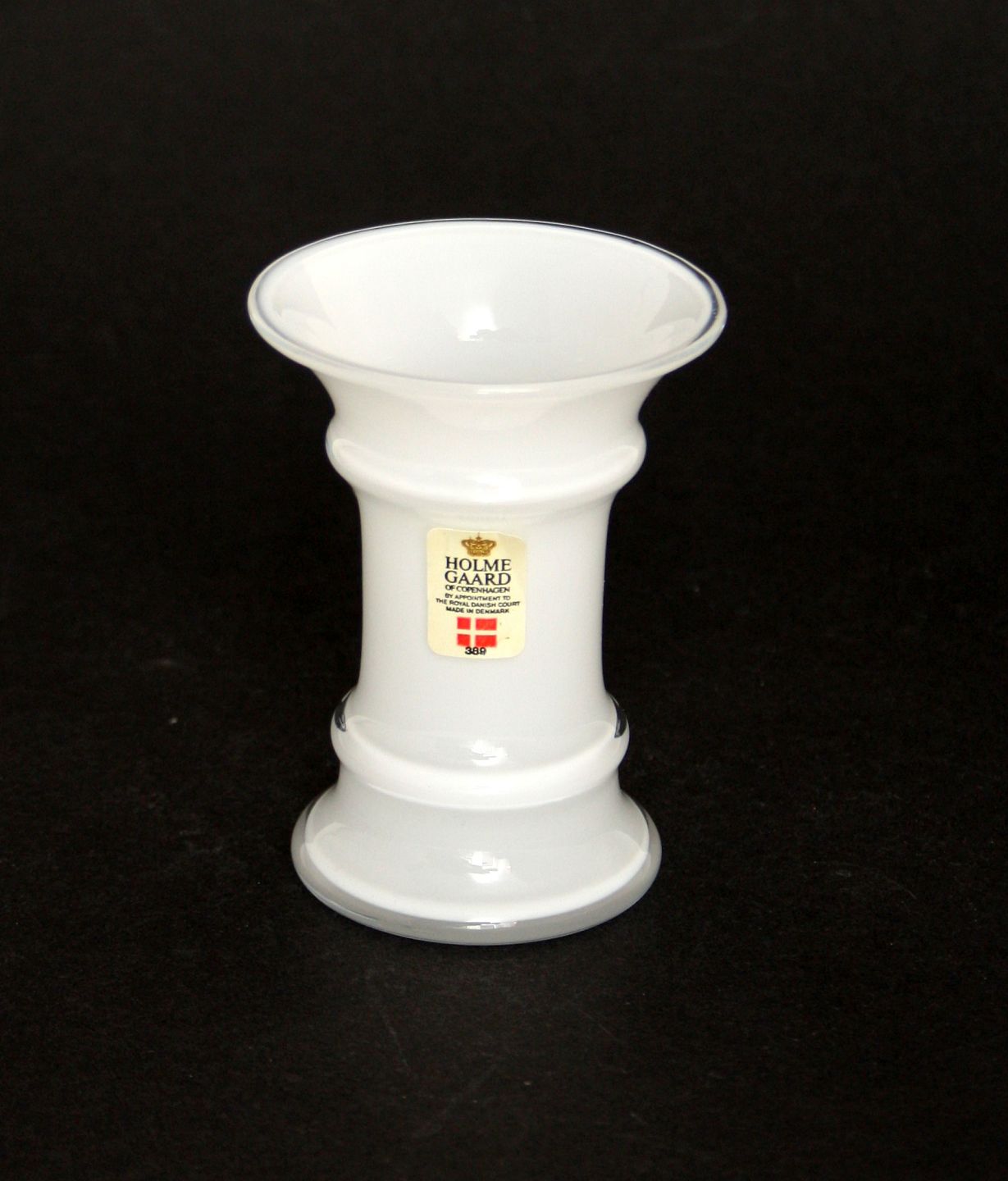 Holmegaard, MB serien opalhvid glas med klart overfang. Designet af Michel Bang i 1981. Ingen signatur i serien. Lille vase sjælden. Højde 8 cm. Øverste diameter 6,5 cm. Pris: SOLGT