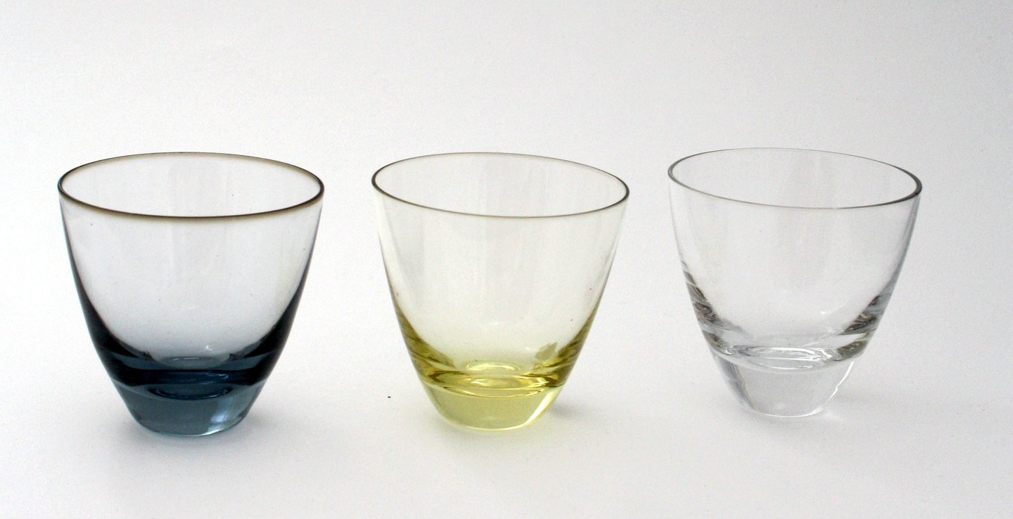 Kosta, Sweden, Shotsglas i flere farver. Højde 7 cm. Øverste diameter 7,5 cm. Klar. Lager: SOLGT Blå. Lager: 4 Gul. Lager: 2
