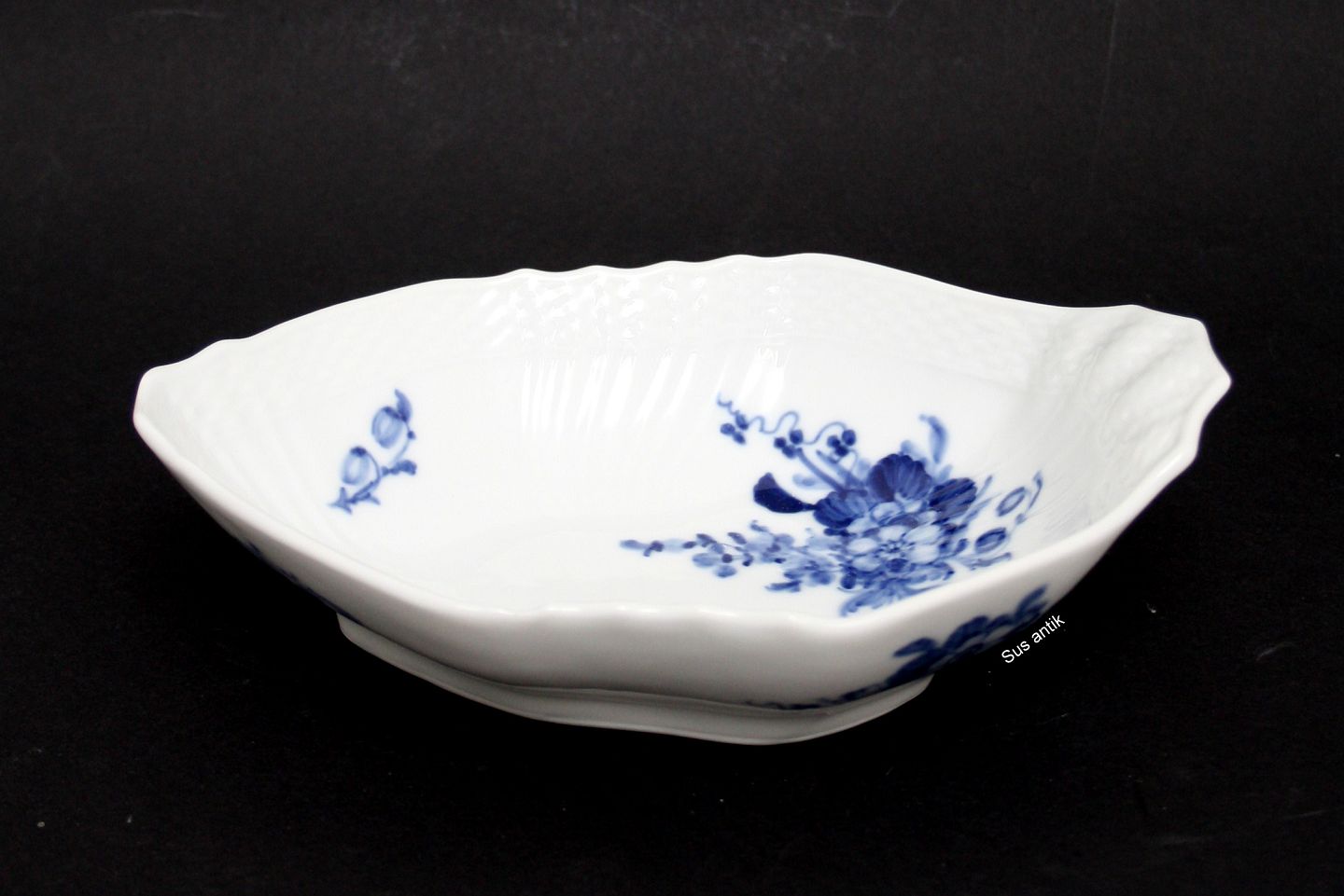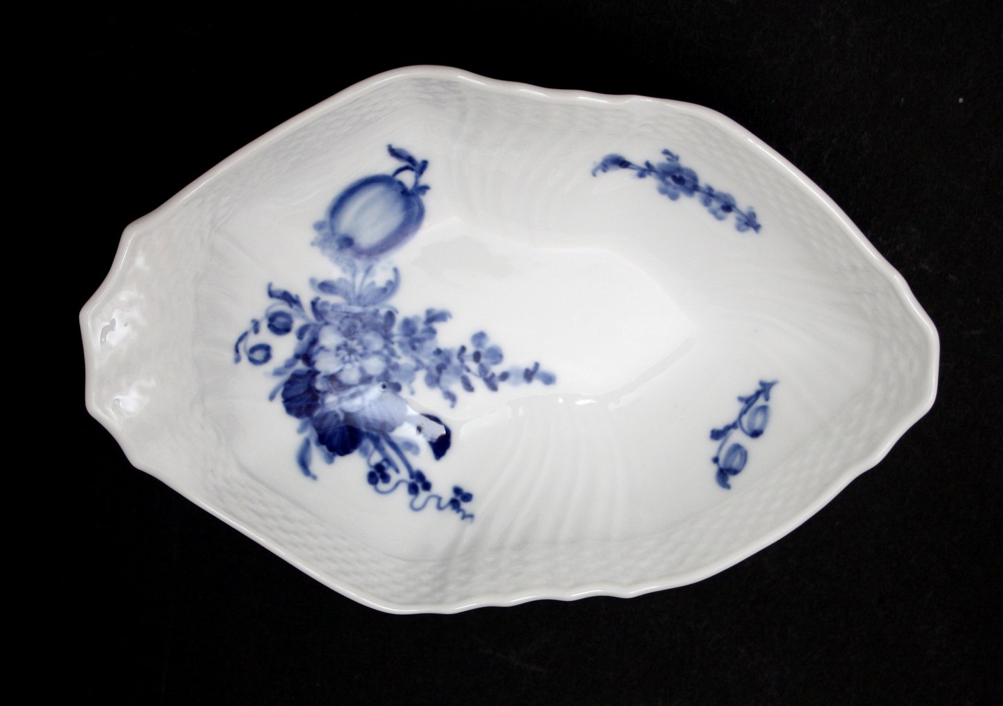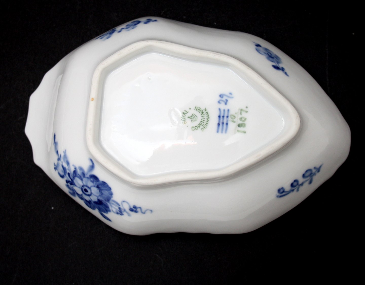 Royal Copenhagen, Blå Blomst Svejfet, Aflang skål. Nr. 10/1807. Produceret fra 1923 og frem. Længde 20,5 cm. Bredde 13,5 cm. Højde 6 cm. II. sortering. Pris: