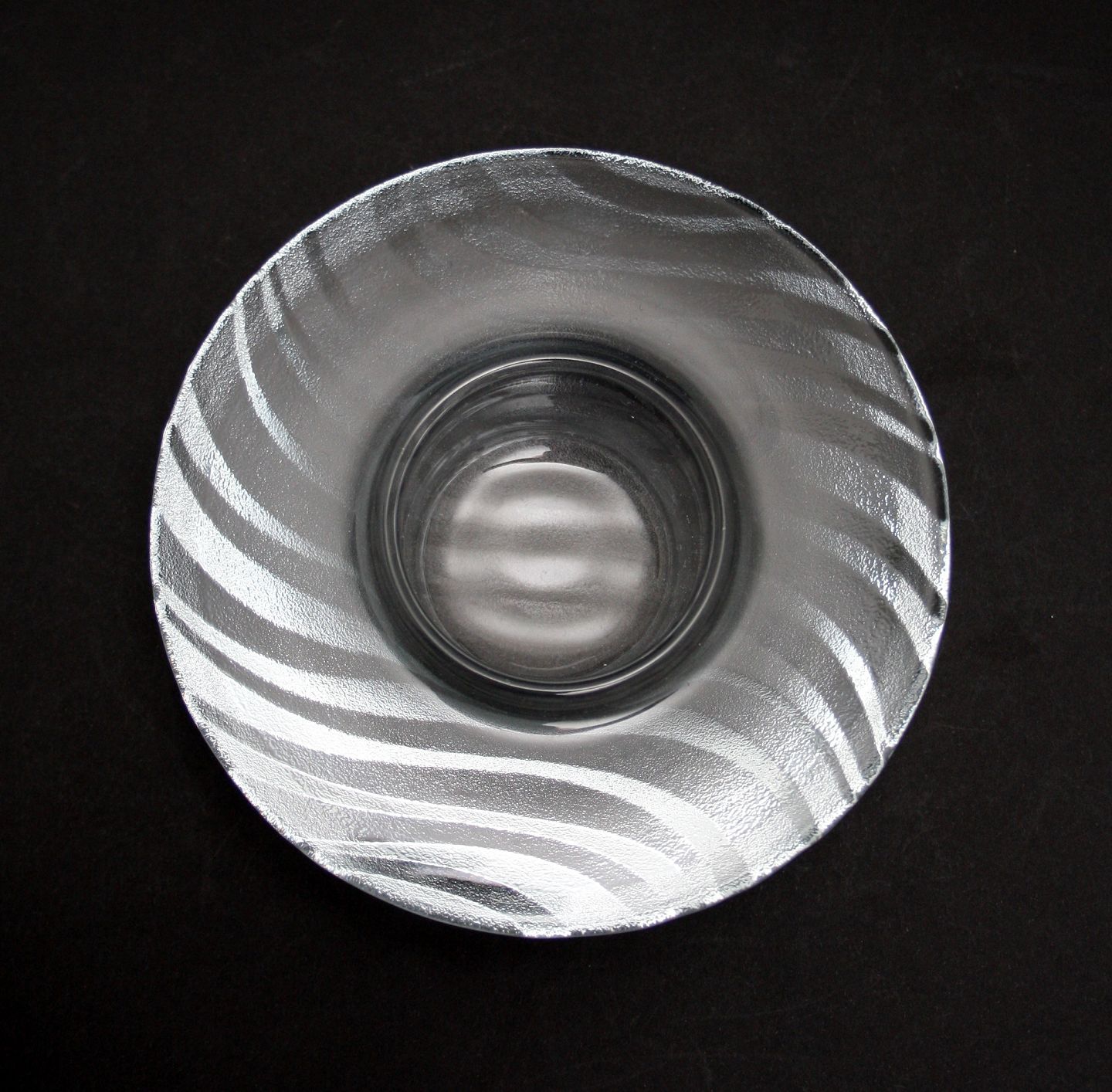 Holmegaard, Skagarak, fyrfadsstage, mellem. Klar glas med ru bagside og bølget mønster. Designet af Torben Jørgensen i 1987. Diameter 13,5 cm. Højde 4 cm. Pris: 100 kr. stk. Lager: 2