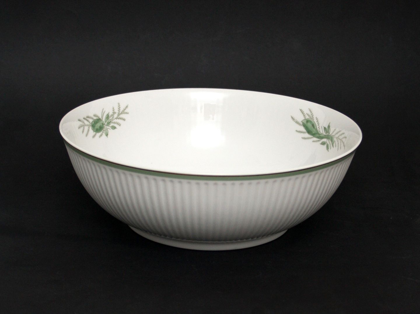 Royal Copenhagen, Grøn Melodi designet af Thorkild Olsen i 1950'erne. Hvidt riflet stel med guldkant og motiver i grønt. Kartoffelskål. Nr. 1513/14068. Højde 7,3 cm. Diameter 21,7 cm. I. sortering med lille brændingsplet indvendig i bund. Pris: SOLGT