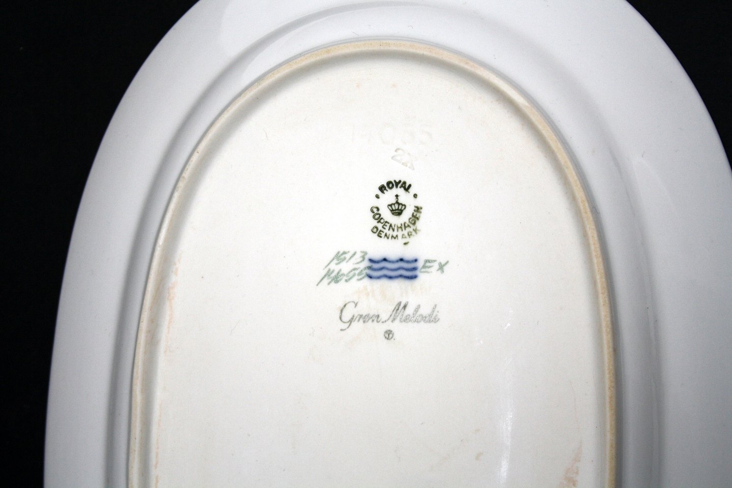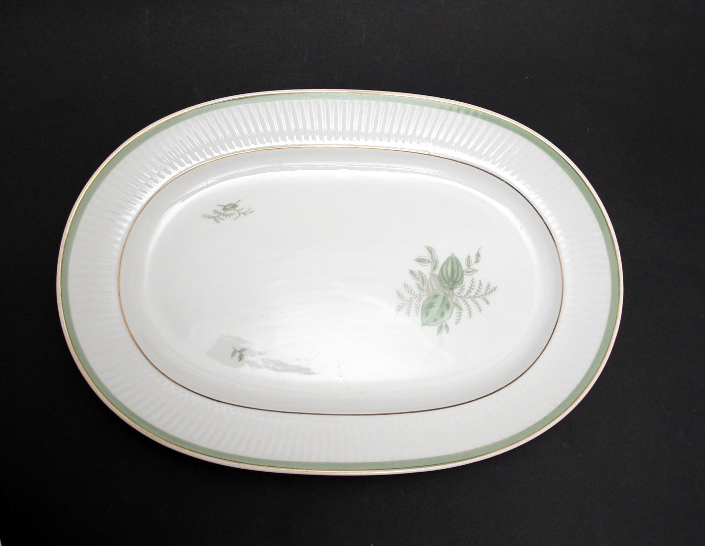 Royal Copenhagen, Grøn Melodi designet af Thorkild Olsen i 1950'erne. Hvidt riflet stel med guldkant og motiver i grønt. Aflangt fad. Nr. 1513/14055. Længde 27,7 cm. Diameter 19 cm. I. sortering. Pris: 375 kr. Lager: 1