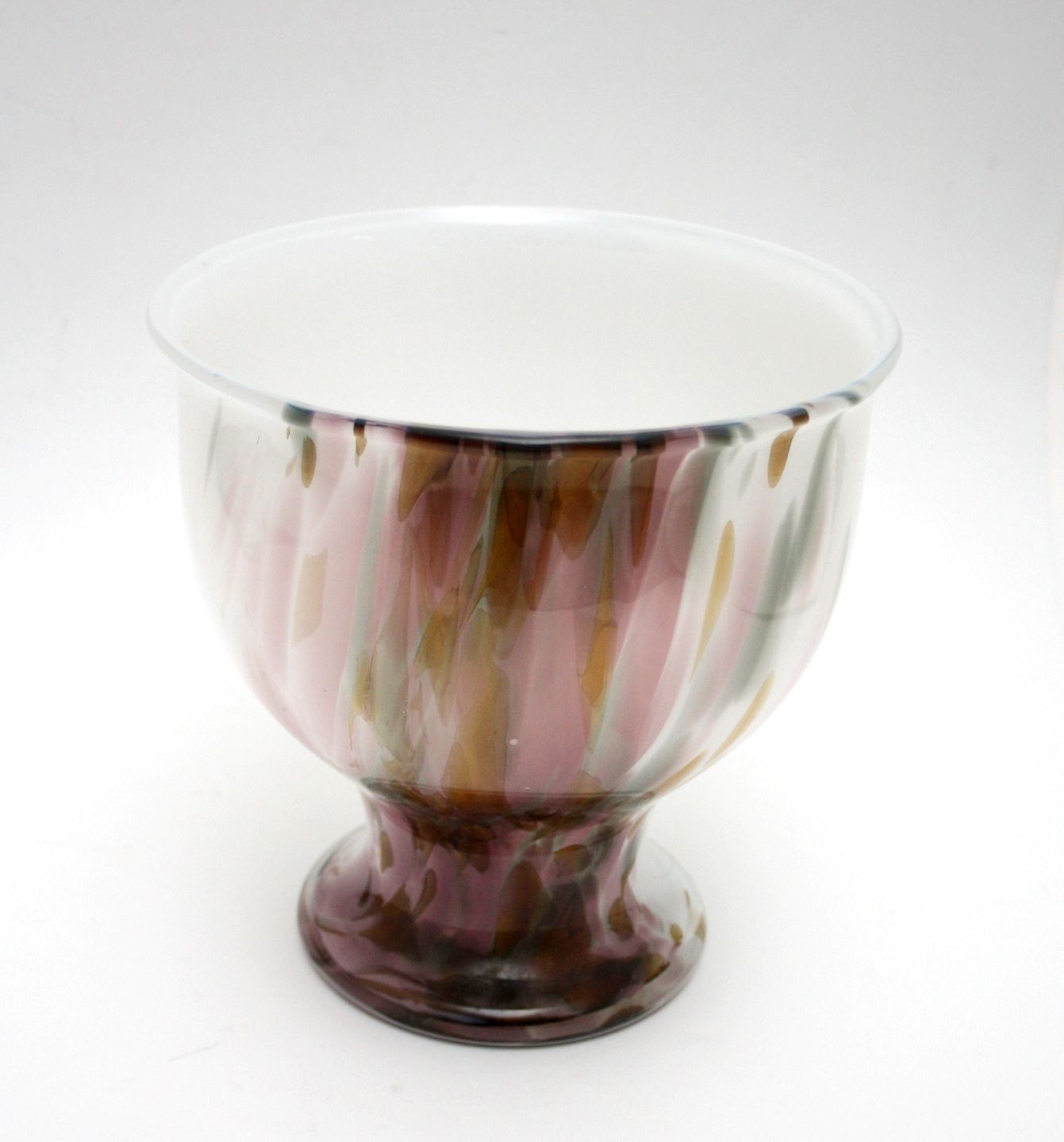 Holmegaard, Najade, skål på fod, opal hvid med farvede glasstykker. Designet af Per Lütken, produceret fra 1976-1987. Signeret HG. Højde 18 cm. Diameter 18 cm. Pris: 650 kr.