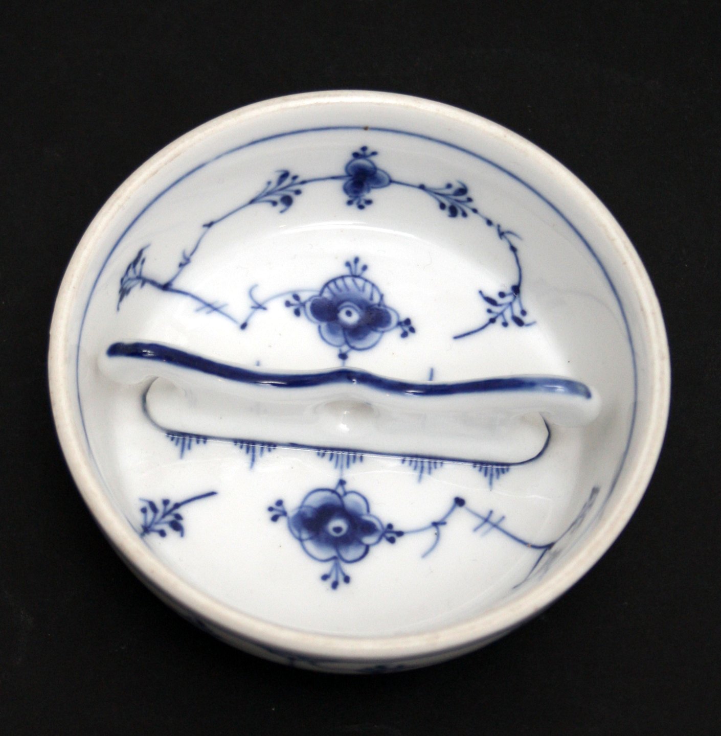 Bing og Grøndahl, Blåmalet (Musselmalet). Pibe eller cigaraskebæger med tværholder. Gammelt B&G mærke produceret før 1915. Højde 3,5 cm. Diameter 10 cm. I. sortering. Perfekt stand. Pris: SOLGT