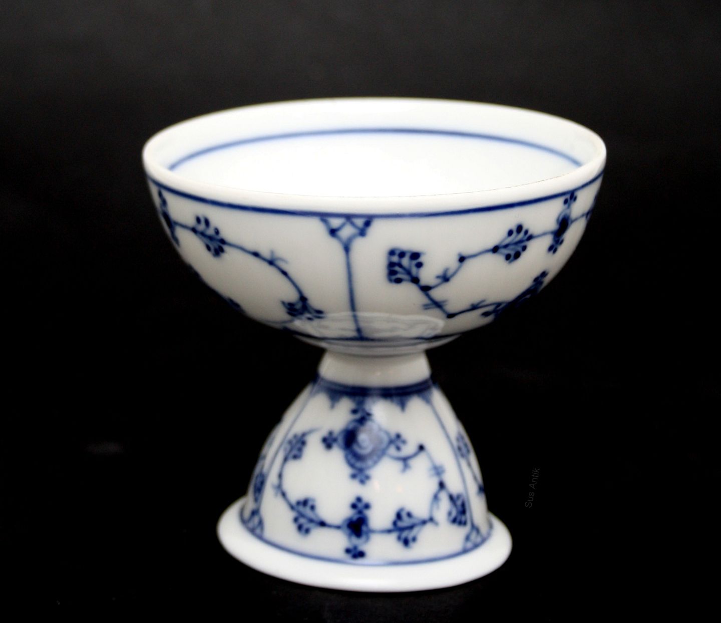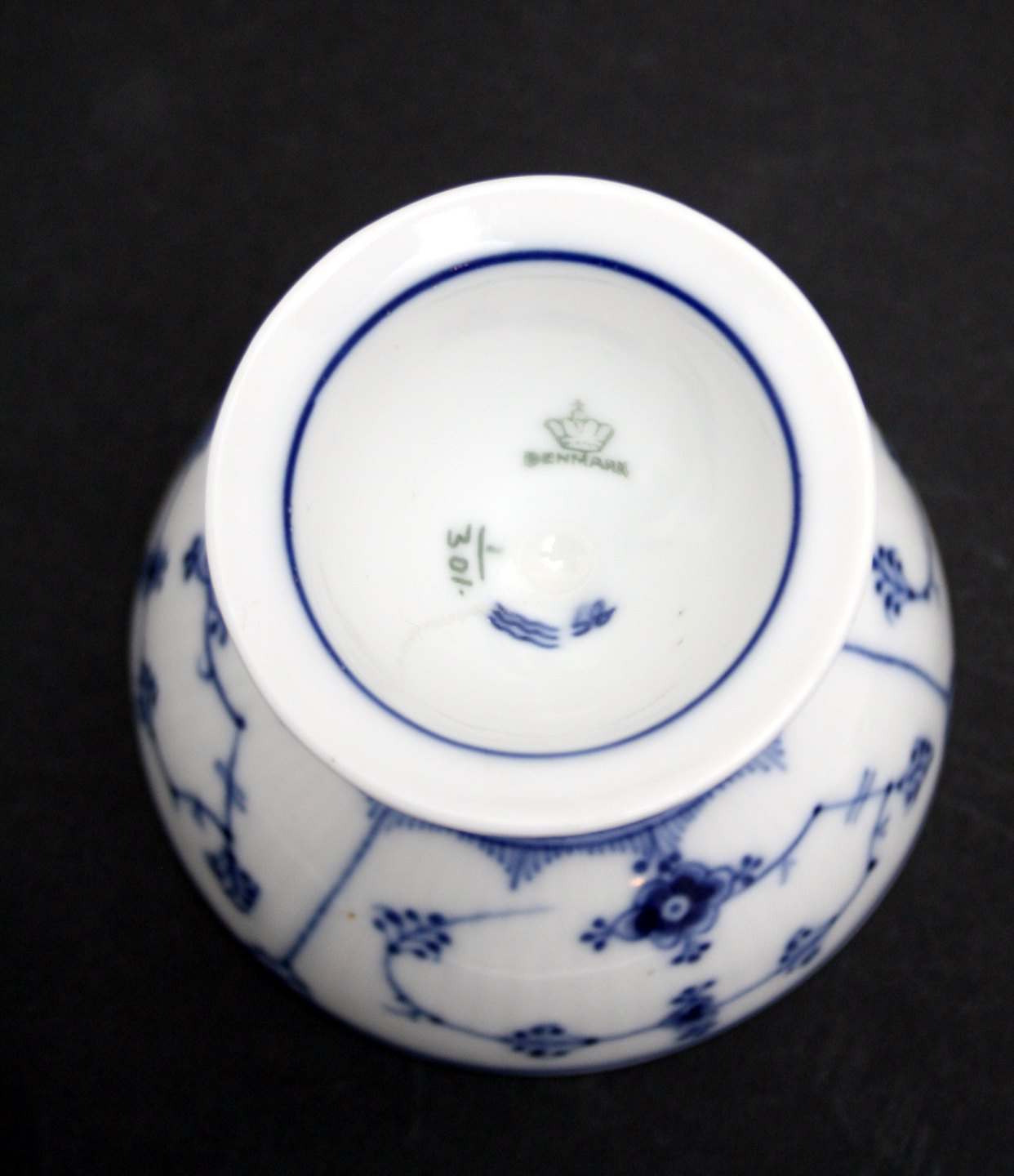 Royal Copenhagen, Musselmalet riflet. Dobbelt æggebæger. Sjælden. Nr. 1-301. Diameter 9 cm. Højde 8 cm. Fod diameter 6 cm. I. sortering. Ikke gennemgående glasur hårrevne indvendig i fod. Pris: 2100 kr. stk. Lager: 1