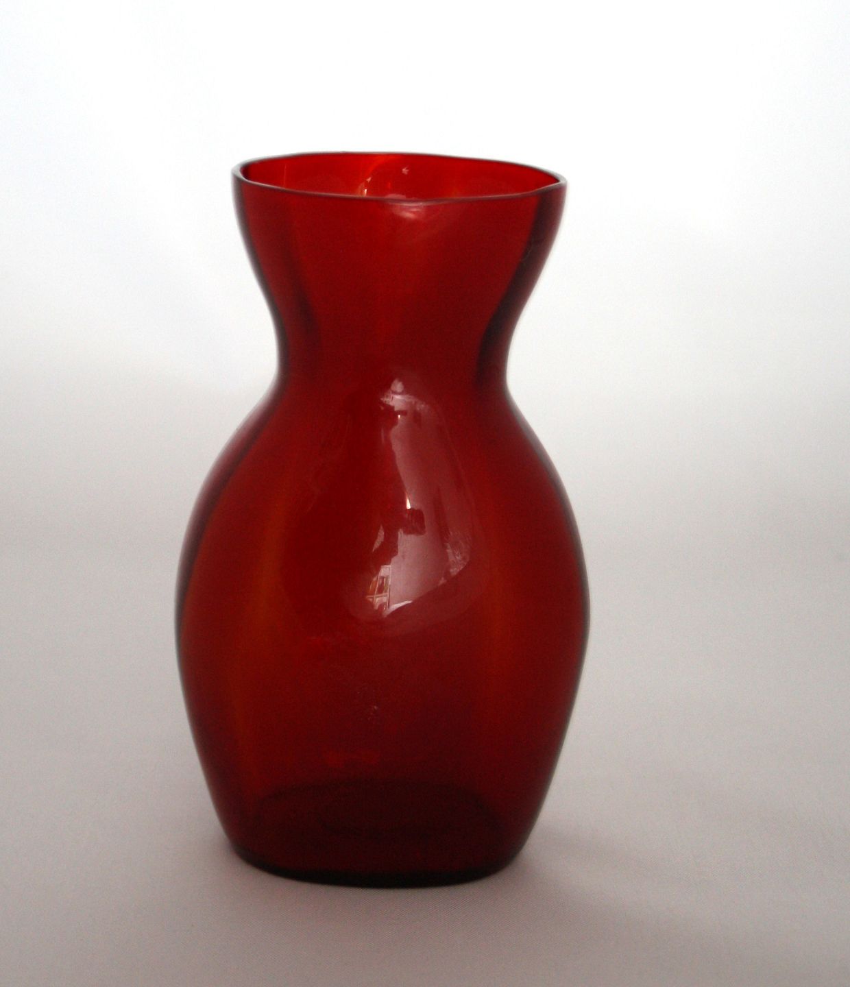 Hyacint vase i rubinrød med optiske striber. Højde 14,5 cm. Øverste diameter 7 cm. Pris: SOLGT