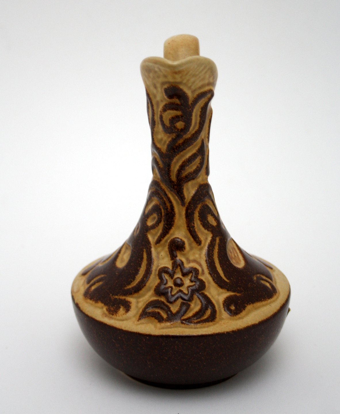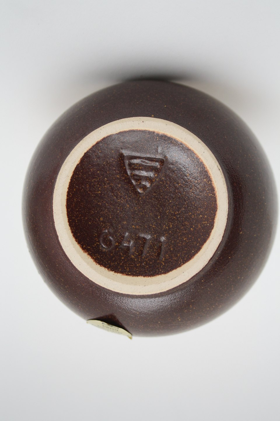 Michael Andersen, Bornholm. Brun stentøjserie fra 1960'erne med forskellige motiver. Kande eller vase med motiv af liggende hjort buk. Højde 15 cm. Nr. 6471. Stemlet i bund. Prik med manglende glasur i den brune bund. Fin stand. Pris: 325 kr.
