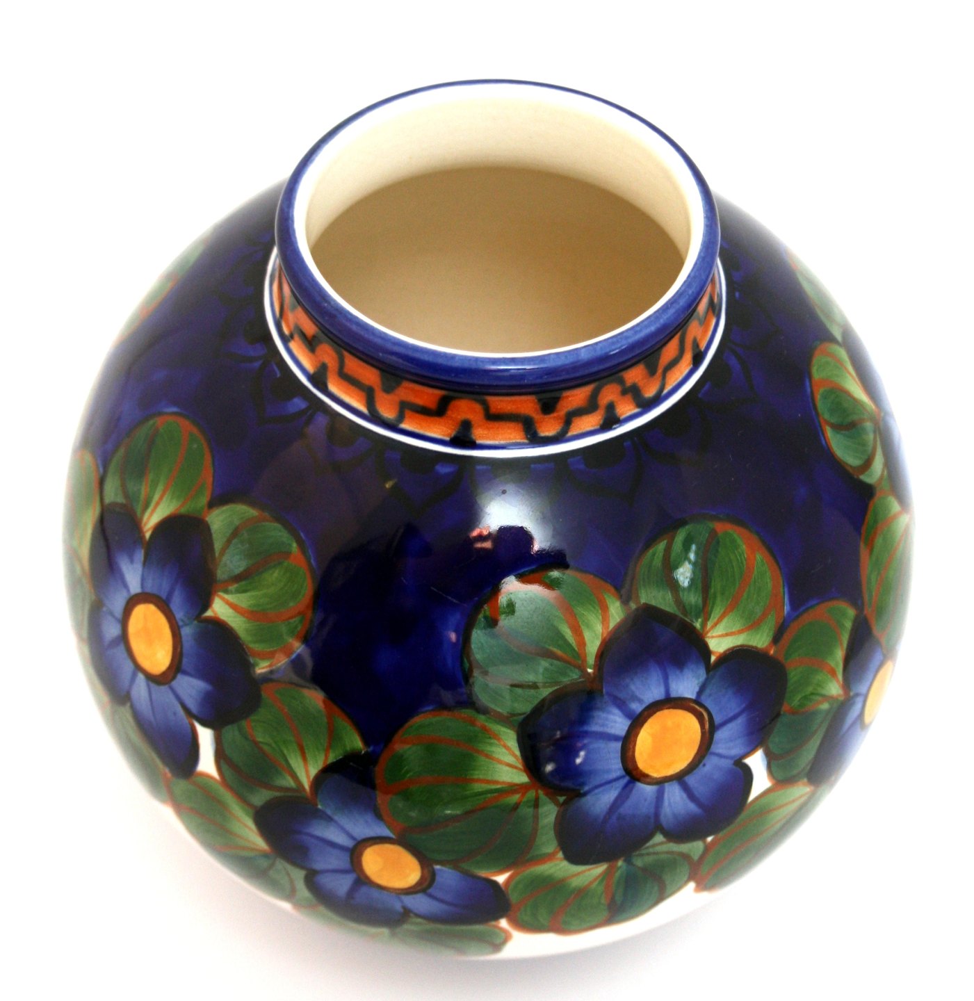 Aluminia, Kugle vase, rund vase fra skønvirkeperioden dekoration "Heibergs blå blomster." Designet af Harald Slott-Møller i 1912. Nr. 838/431. Højde 16 cm. Største diameter ca. 14 cm. Flot stand med overfladekrakeleringer, ingen afslag. Pris: SOLGT