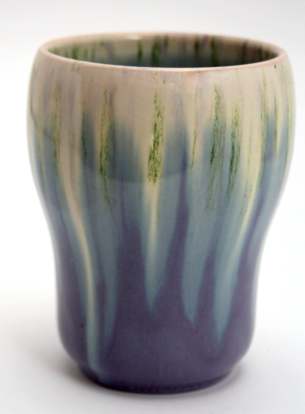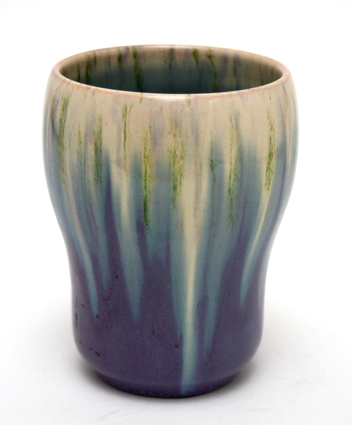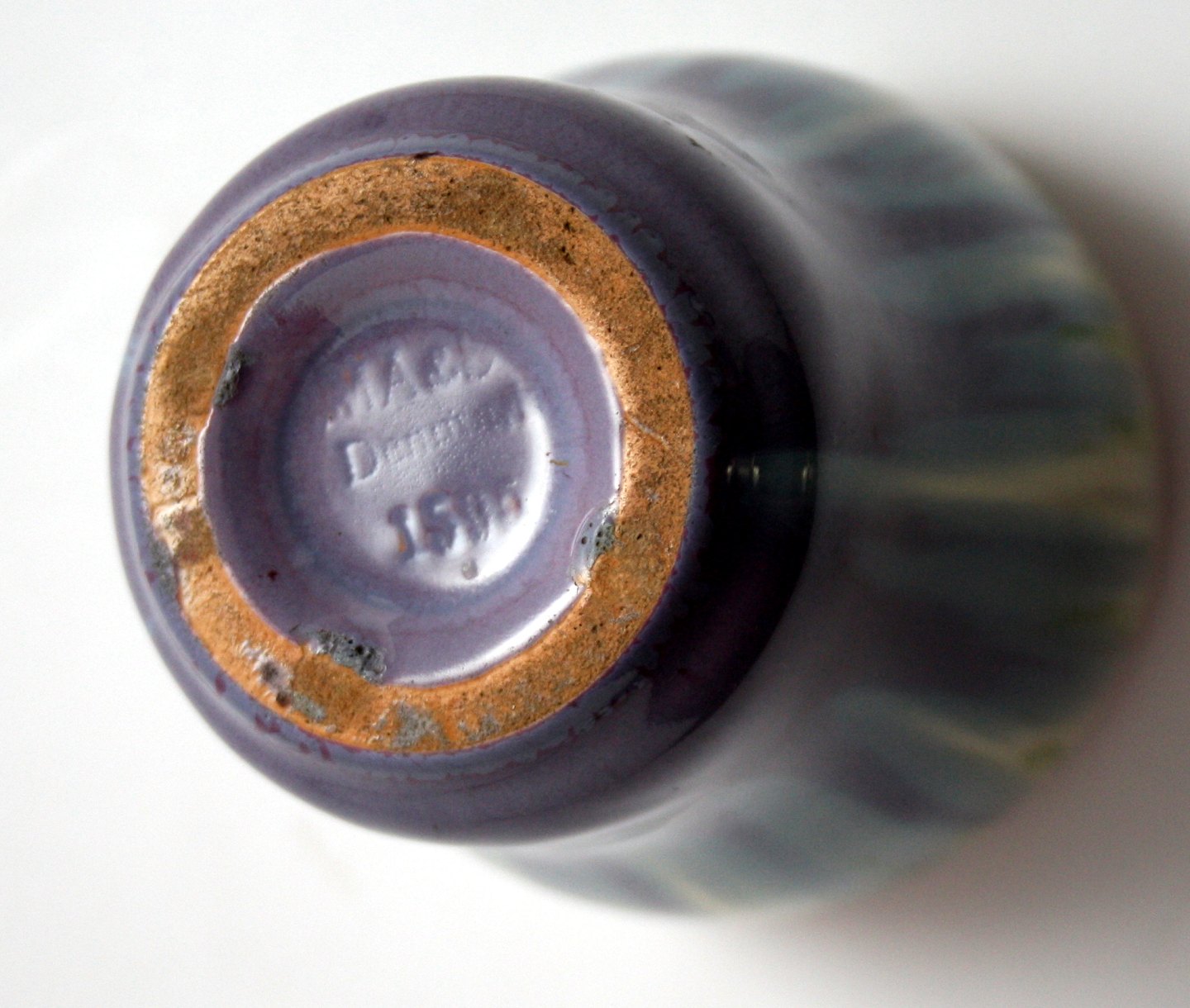 Michael Andersen & Søn, Bornholm, Lille vase med løbeglasur i lilla, lys blå, grøn og lyse farver. Stemplet MA&S Danmark utydeligt nr. men antageligt 1505. Højde 10 cm. Øverste diameter 7 cm. Flot stand. Pris: 525 kr.