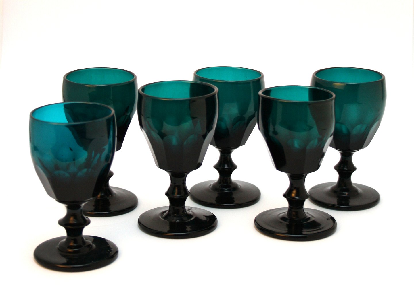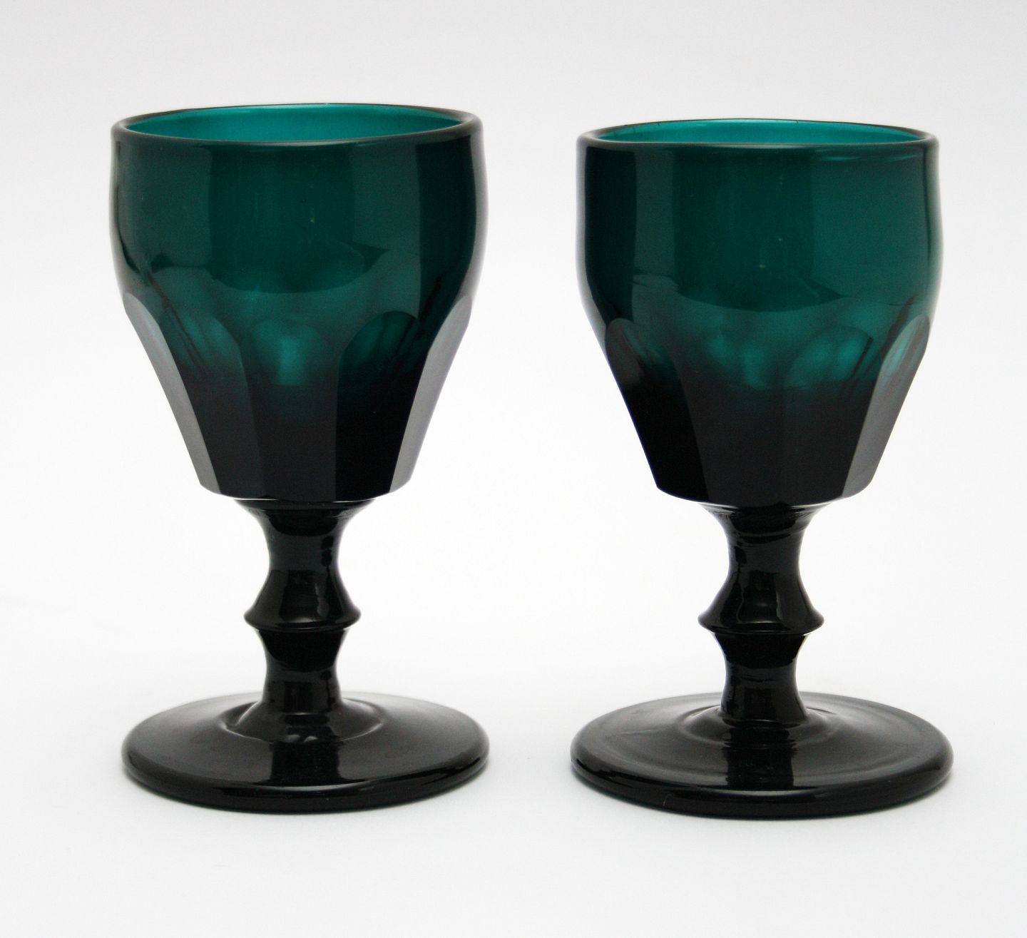 Antagelig Holmegaard, Ædelgrønne tøndeglas med facetslibning på kumme, facetslibningerne varierer lidt i højde og bredde. Fra 1850/1870'erne. Sjældne. Højde 10,8-11 cm. Øverste diameter 6 cm. Fremstår i fin stand. Pris: 350 kr. stk. Lager: 6