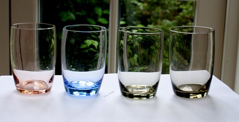 Ølglas med blå stilk. Antageligt fra Kastrup glasværk i 1950'erne, stilken har samme blå farve som de Hollandske snapseglas fra Kastrup og er formentlig brugt sammen med disse. Højde 16 cm. Øverste diameter 6 cm. Pris: 75 kr. stk. Lager: 12+