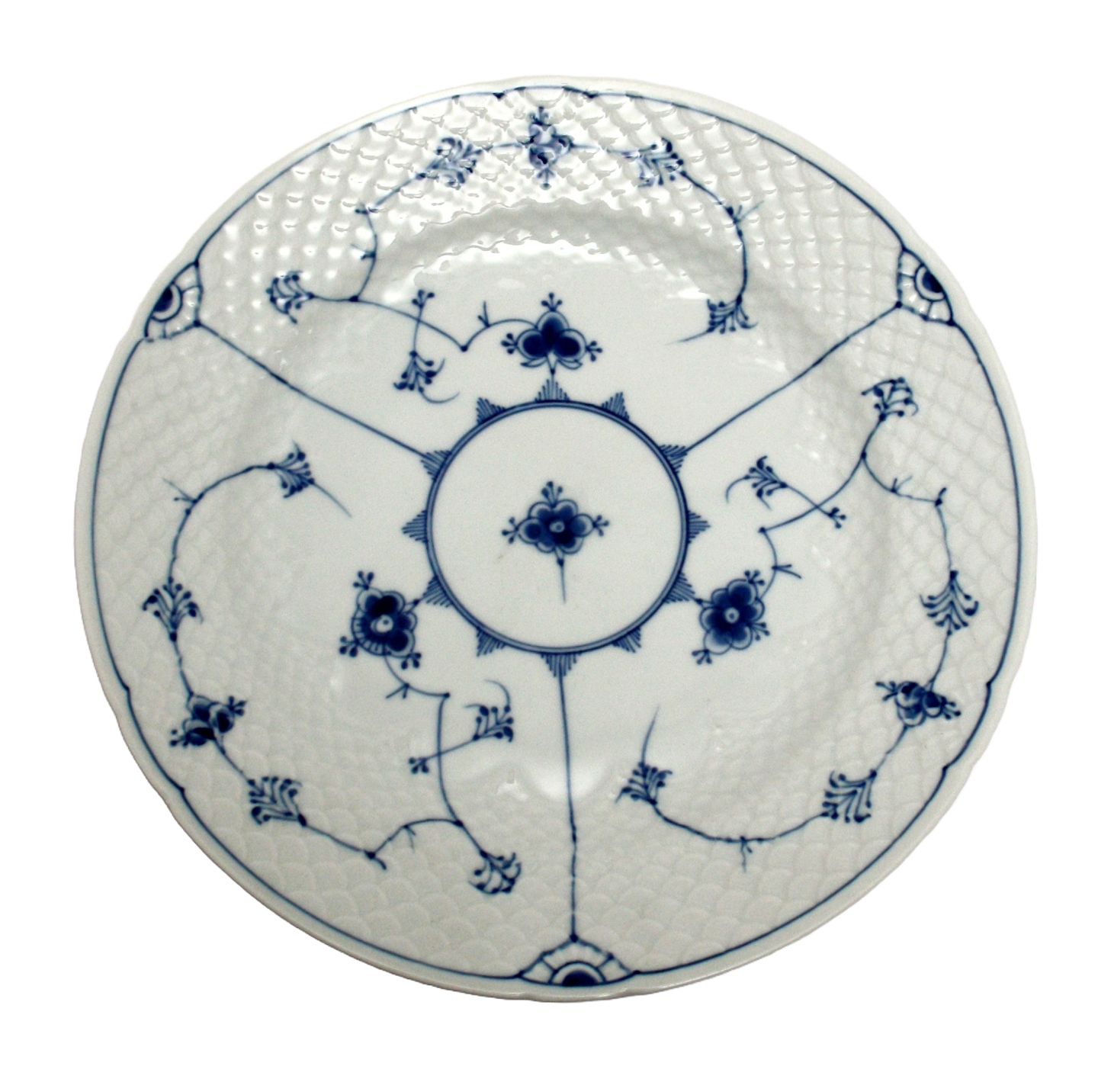 Bing og Grøndahl, Blåmalet (musselmalet), hvidt porcelæn med skelmønster. Stor flad middagstallerken. Nr. 25A. Produceret 1952-1958 fremgår af mærket. Diameter 26 cm. II. sortering. Brugsslid på overflade. Enkelte med små brændingspletter. Pris: SOLGT