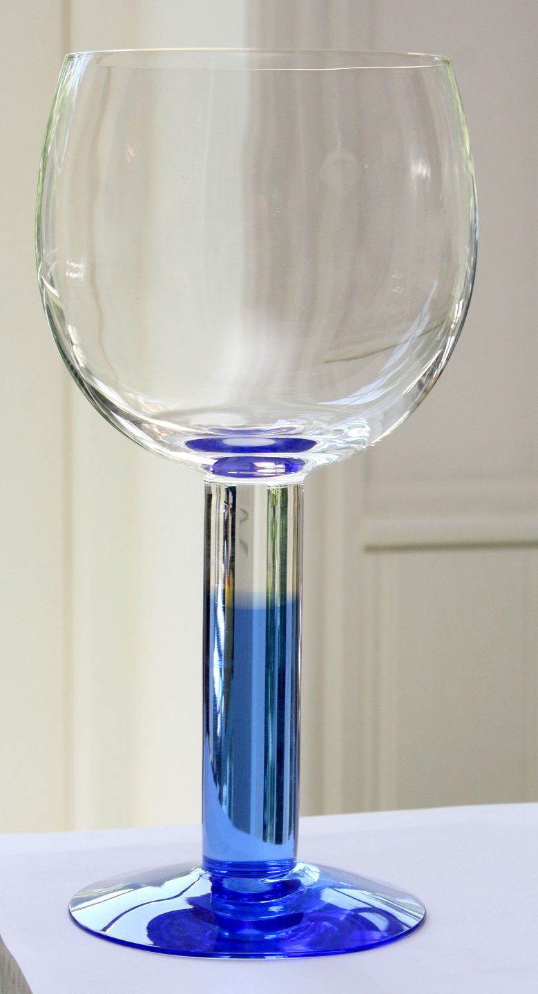 Iittala, Finland, Mondo designet af Kerttu Nurminen i 1988. I produktion indtil 2003. Pokal, øl eller Bourgogne med blå stilk. Højde 23 cm. Diameter 10 cm. Pris: SOLGT