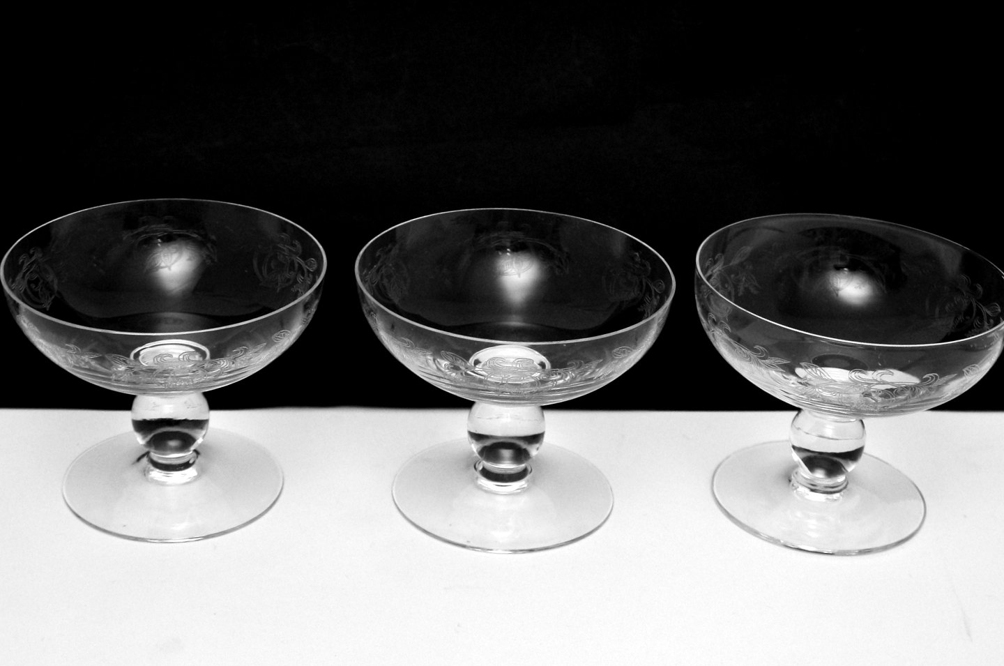 Gerda glas med ætsning nr. 5 produceret af Kastrup glasværk fra 1938 til 1950'erne. Champagneskål. Højde 8 cm. Diameter 10 cm. Pris: 150 kr. stk. Lager: 3