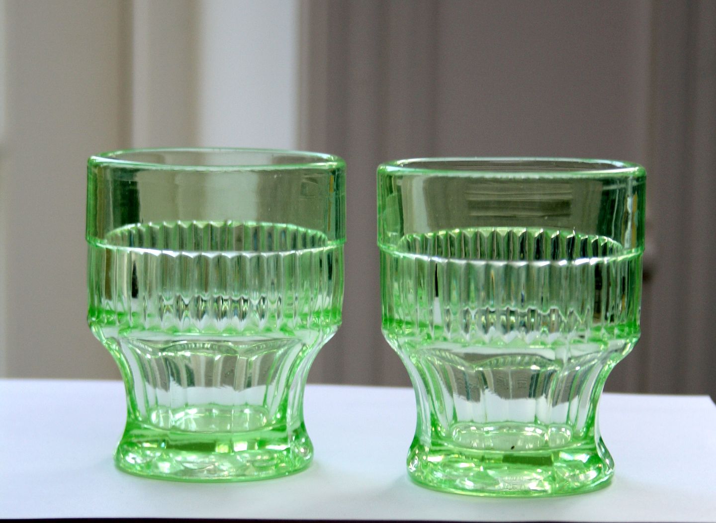 Holmegaard, Stableglas, vandglas i urangrøn. Designet i 1938 af Jacob E Bang. Højde 8,8 cm. Diameter 7,5 cm. Yderst sjælden. Pris: SOLGT