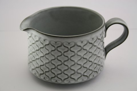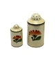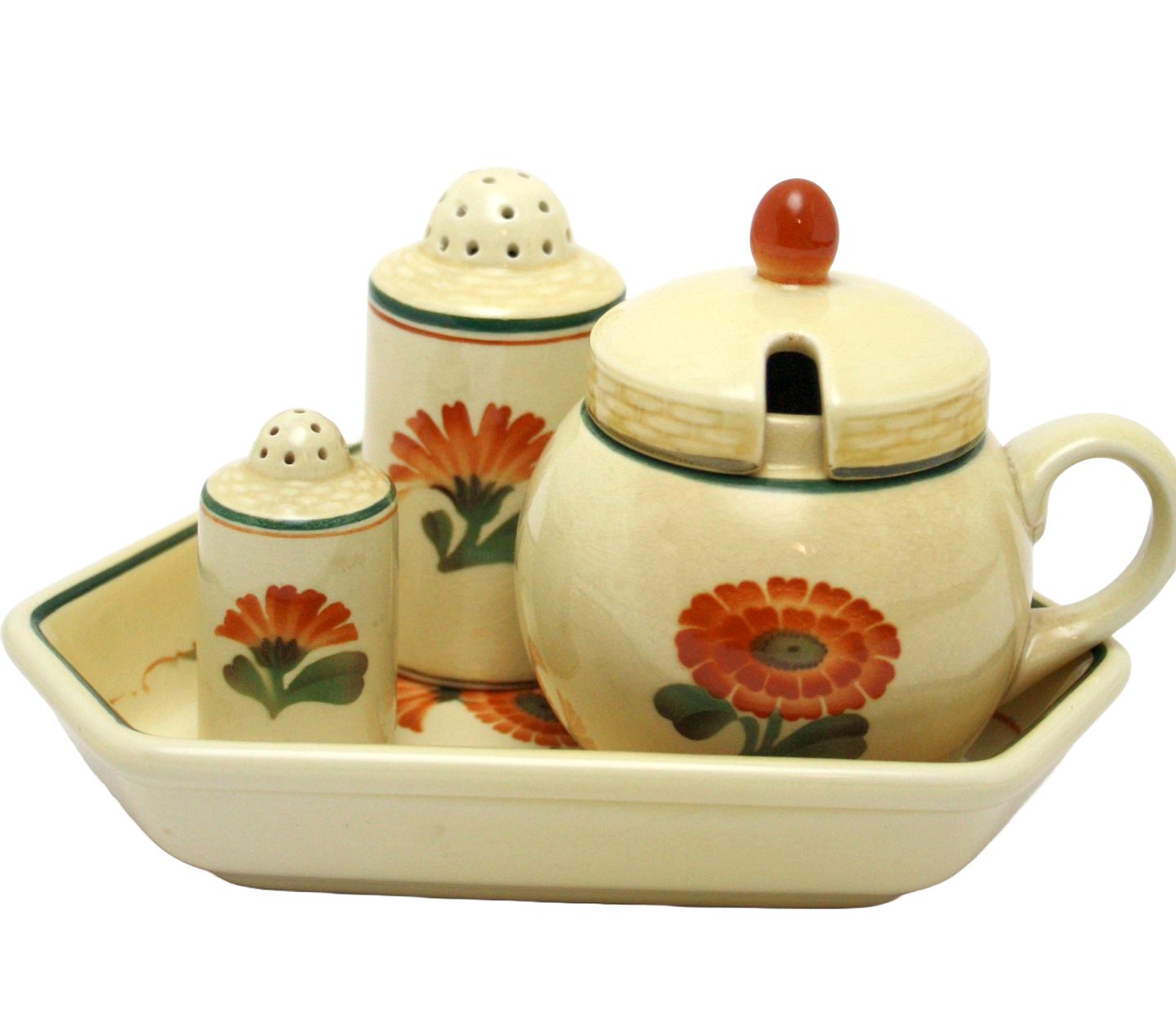 Aluminia, Morgenfrue. Designet af Niels Thorsson. Produceret i perioden 1934-1967. Luftmalet. Plat de Menage bestående af salt, peber, sennep med låg og trekantet bakke. Let overfladekrakelering ellers fin stand. Pris: SOLGT