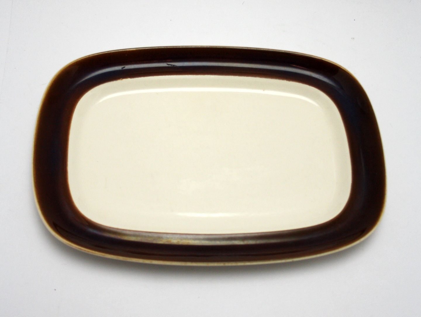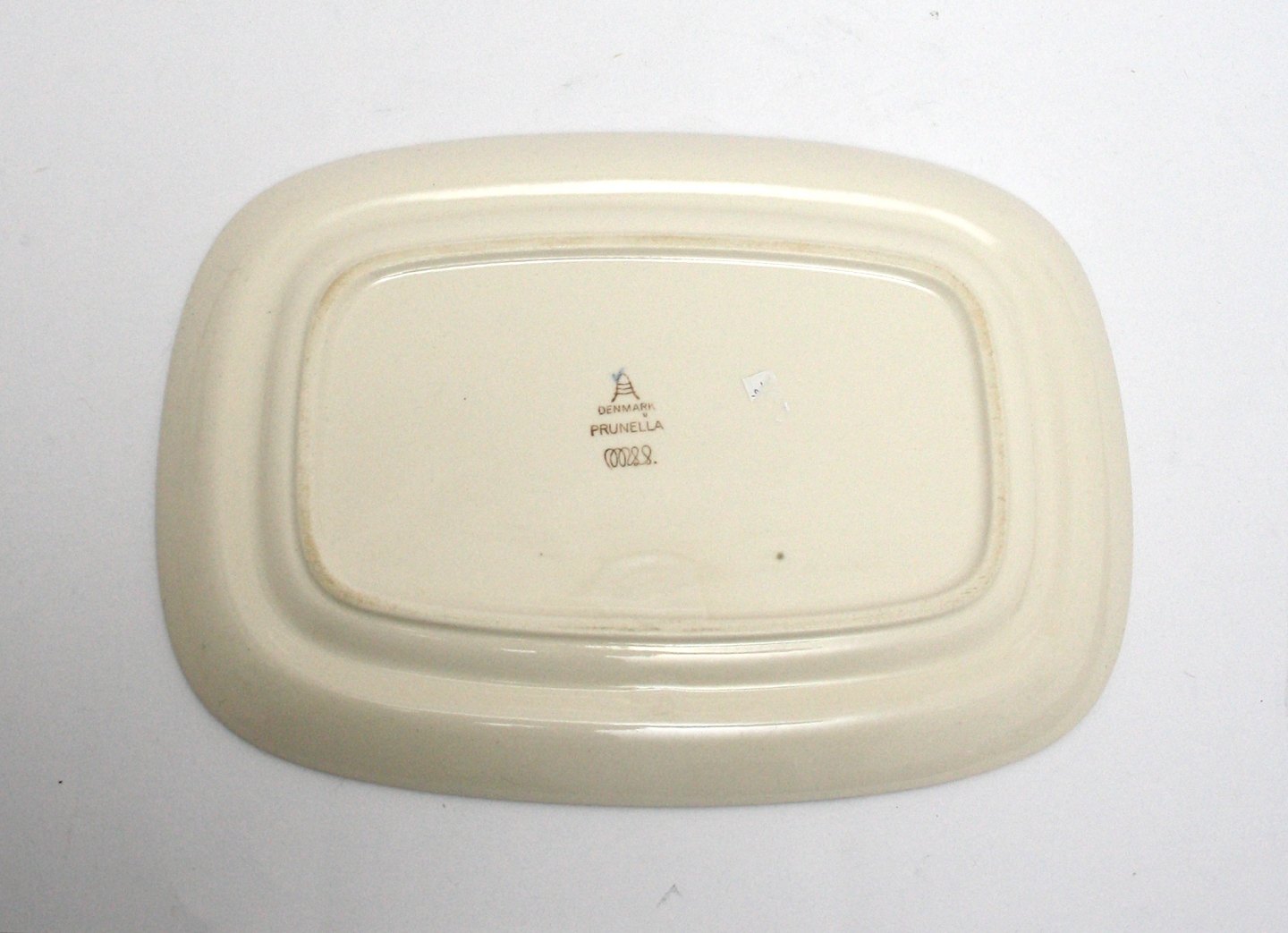 Aluminia, Prunella, Aflangt fad, creme med blommefarvet fane. Designet af arkitekt Magnus Stephensen i 1960. Luftmalet. Længde 27 cm. Bredde 19,5 cm. Flot stand med lidt overfladeridser. Pris: 290 kr. stk. Lager: 1