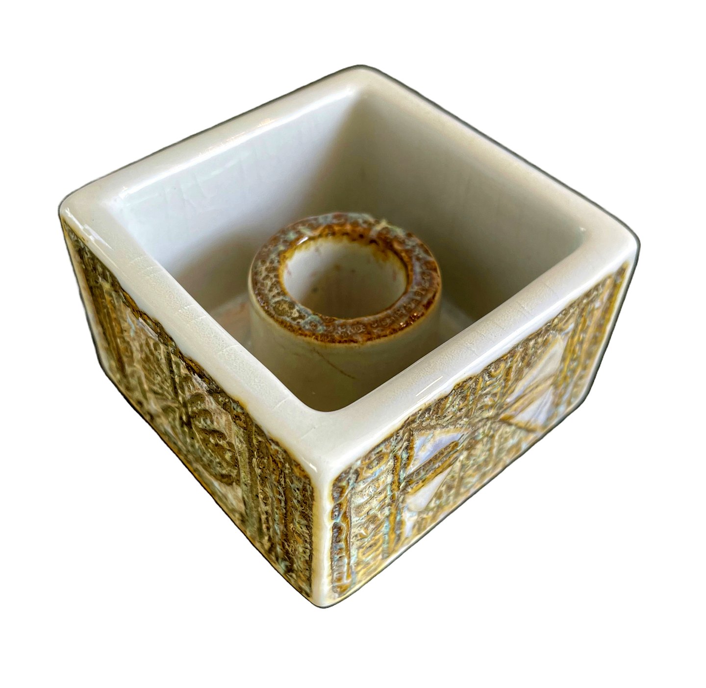 Aluminia kunstfajance, Tenera, Lysestage. Designet af Kari Christensen, Norge. Tenera blev produceret i perioden 1958-1967. Nr. 531/3410. Højde 4,2. Mål 7 x 7 cm. Lettere overfladekrakelering. Pris: 200 kr.