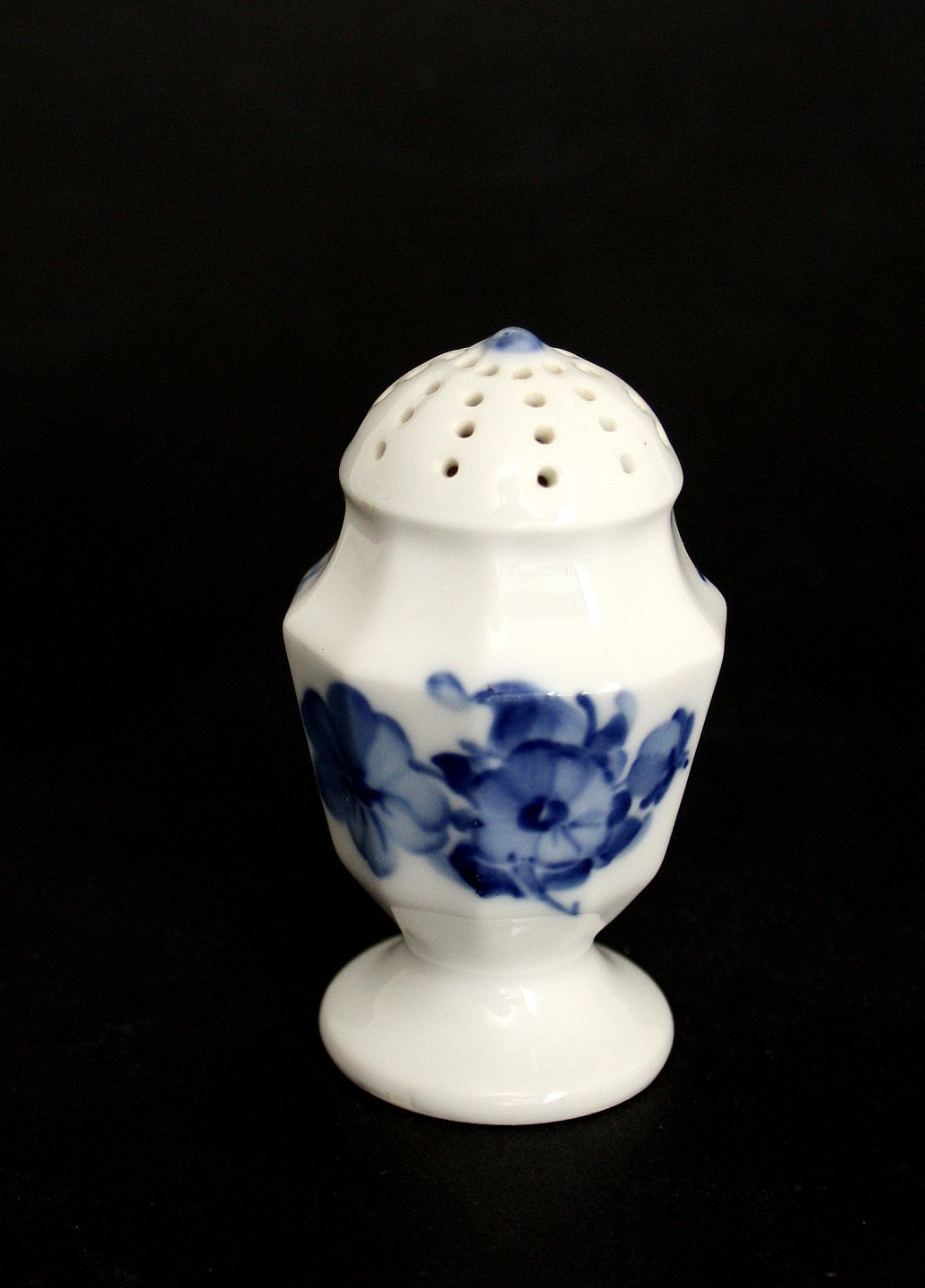 Royal Copenhagen, Blå Blomst kantet, Saltbøsse. Sjælden udgave da der er en blå knop i toppen, hvor der normalt er et S. Højde 8 cm. I. sortering. Leveres med original prop, men ny gummiprop kan tilkøbes for 20 kr. Pris: 200 kr. stk. Lager: 1