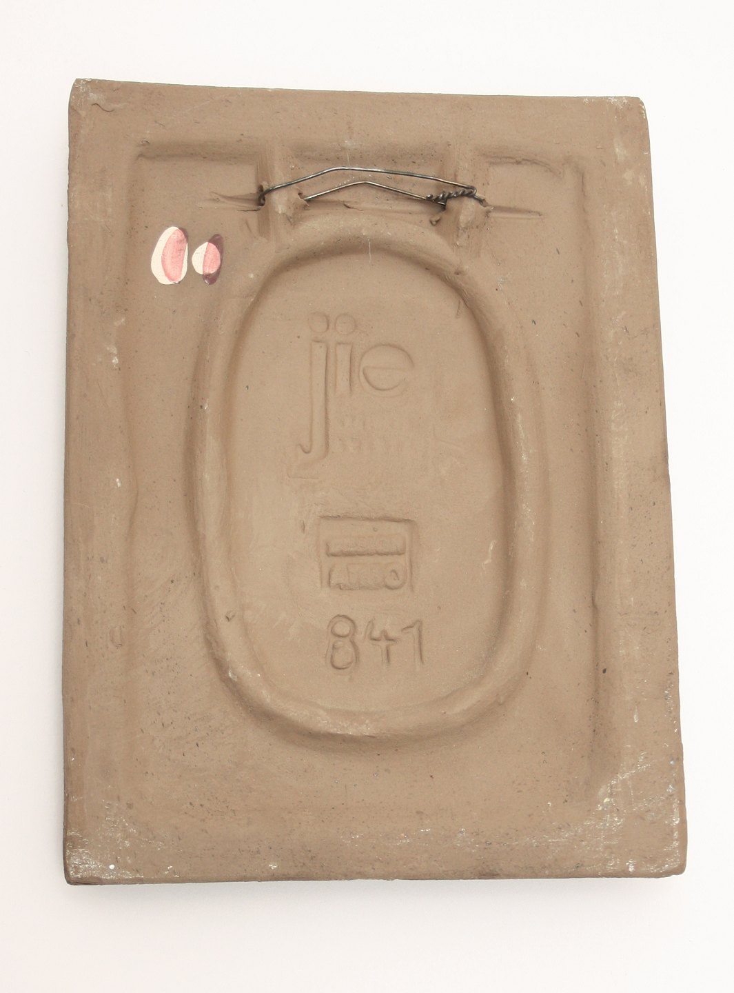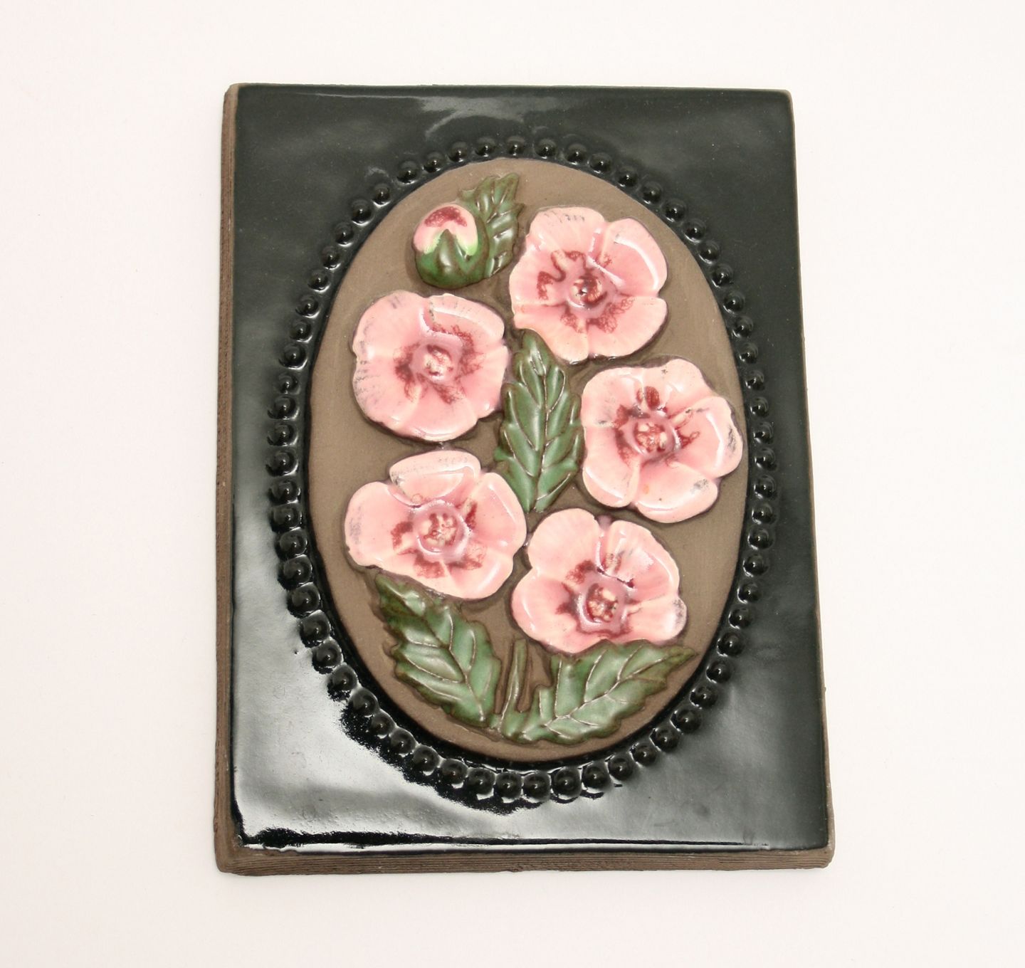 Jie-Keramik, Gantofta, Sweden, Lille relief med lyserøde blomster. Design Aimo. Formnr. 841. Længde 11,5 cm. Højde 15,5 cm. Flot stand. Pris: SOLGT