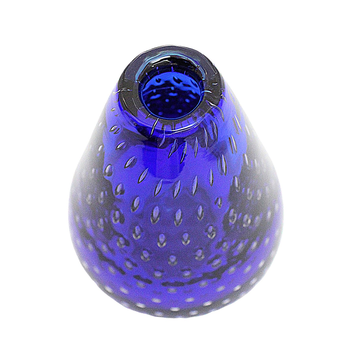Dråbeformet vase med bobler i Koboltfarvet glas. Rundslebet i bund. Højde 14 cm. Største diameter 7,5 cm. Fin stand. Pris: 275 kr.
