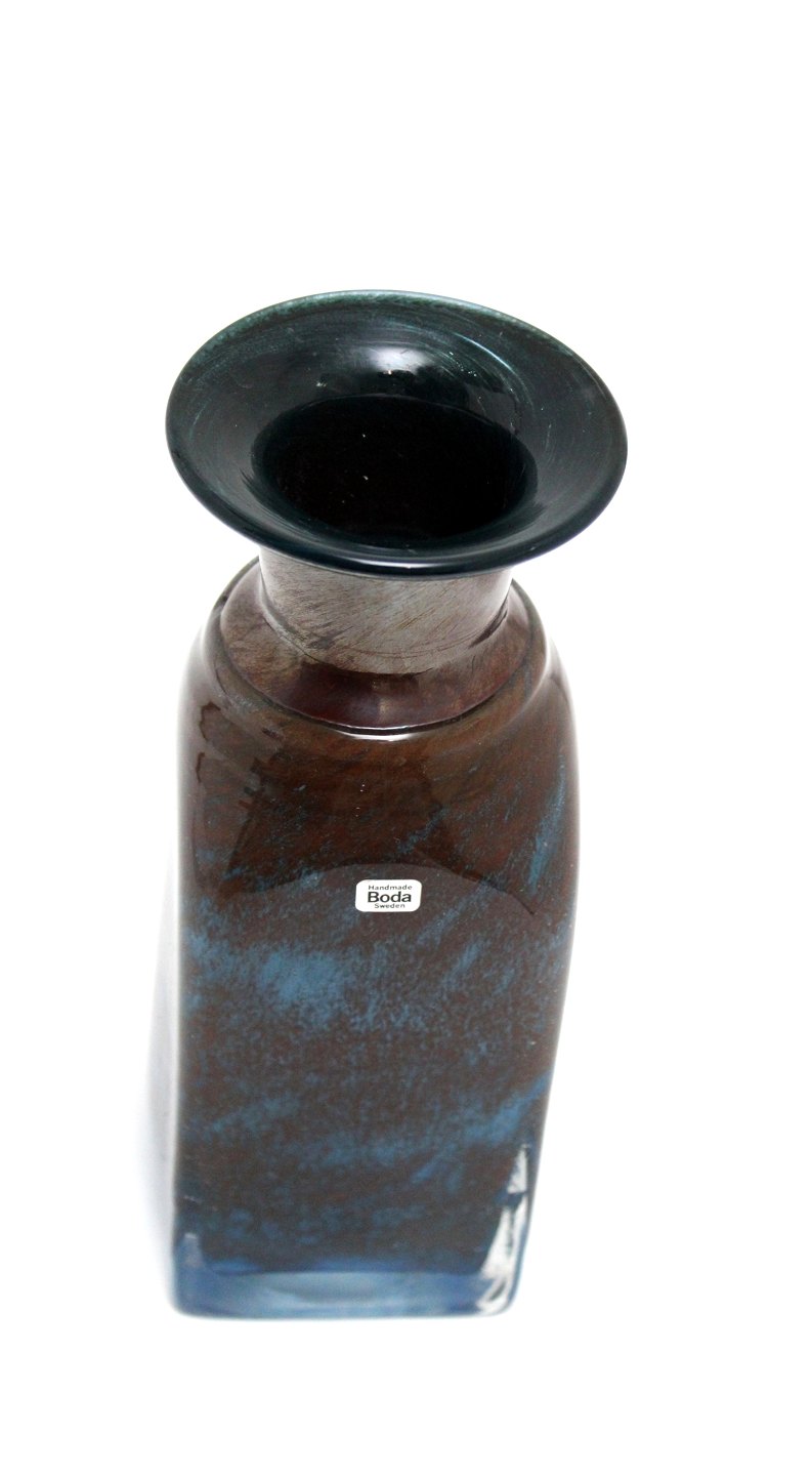 Kosta Boda, Firkantet vase i blå og brune farver. Designet af Bertil Vallien i slutningen af 1970'erne. Vasen er fra Boda, som er en del af Kosta Boda og Åfors glasbruk. Signeret "Boda bvallien 42723". Højde 22 cm. 7,5 x 7,5 cm. Flot stand. Pris: 575 kr.