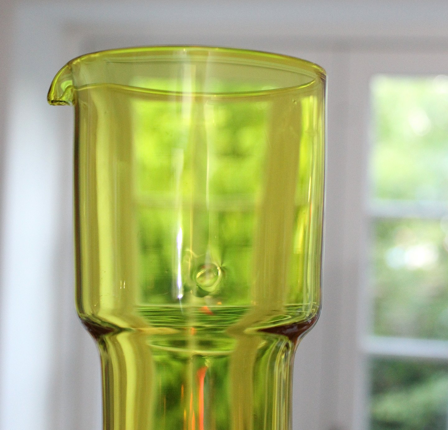 Ryd Glasbruk, Sweden Gul kande. Designet af Christer Jarenskog. Højde 25 cm. Diameter bund 9 cm. Indvendig fabriksfejl boble. Almindelig brugsslid med små ridser. Pris: SOLGT