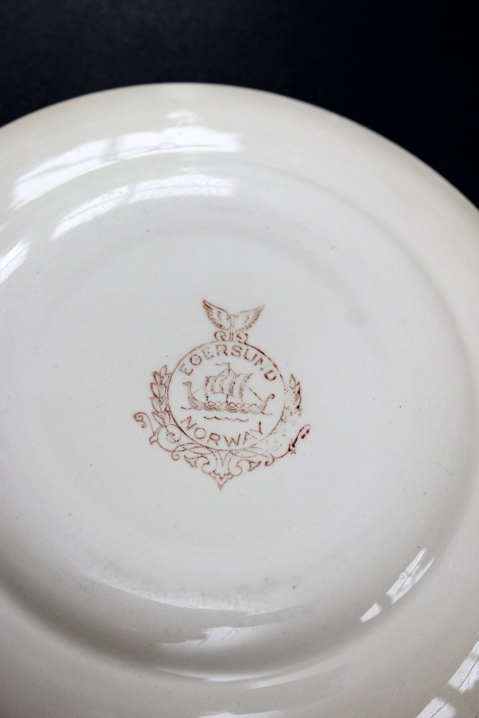 Egersund, Norway, Blå Fasan. Sidetallerken. Fajancestel med blomster og kun 1 fasan. Der er farveforskel og forskellige stempler alt efter, hvornår de er produceret. Diameter 17 cm. Almindeligt brugsslid, med få krakeleringer. Pris: SOLGT