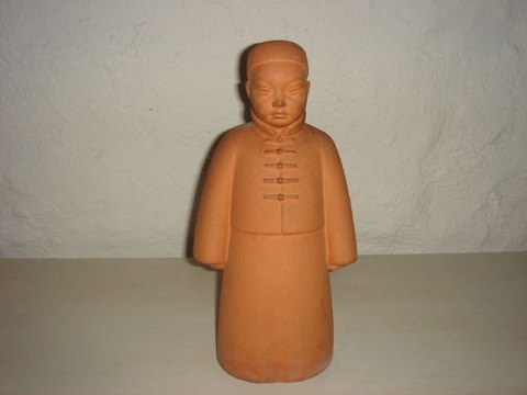 figur i rød terracotta af kinesisk mand. Udført af Sven Lindhardt (1898-1989).Udført omkring 1950. Mærket på undersiden med MADE IN DENMARK og kunstnersignatur Sv.Lindhardt Kina-drengen er 27 cm høj. solgt
