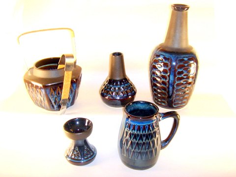 EJ 64 Søholm. Stentøjsserie designet af Einar Johansen i 1964. Reliefdekoration med blå glasur og rå stentøj.