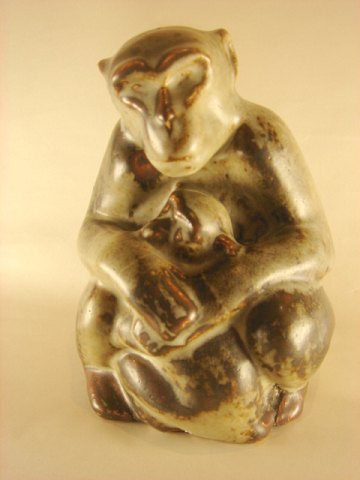 Stentøj. Peder Hald. Signeret HALD inde i figuren. Abemor med unge. Brændingsrevner forneden. Højde 18 cm. solgt.
