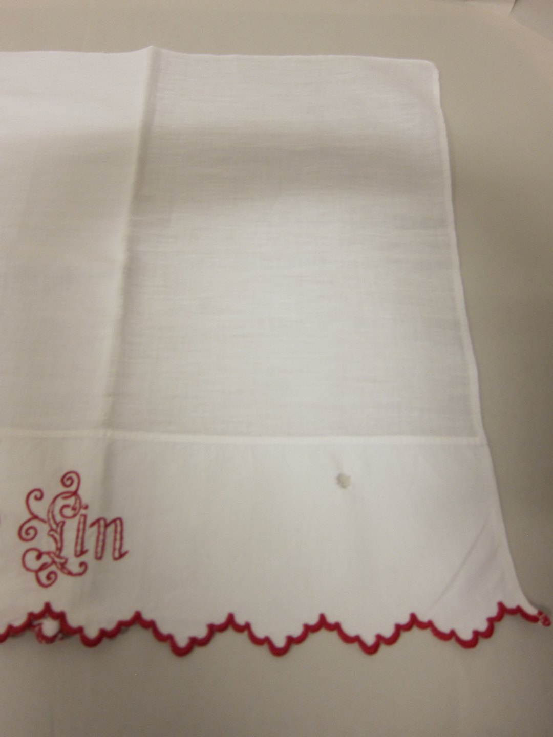 Hvad min kjære Moder gav mig fro - I dette Skab jeg gjemmer tro - Og naar jeg seer det hvide Lin - Jeg tænker på kjær Moder min.