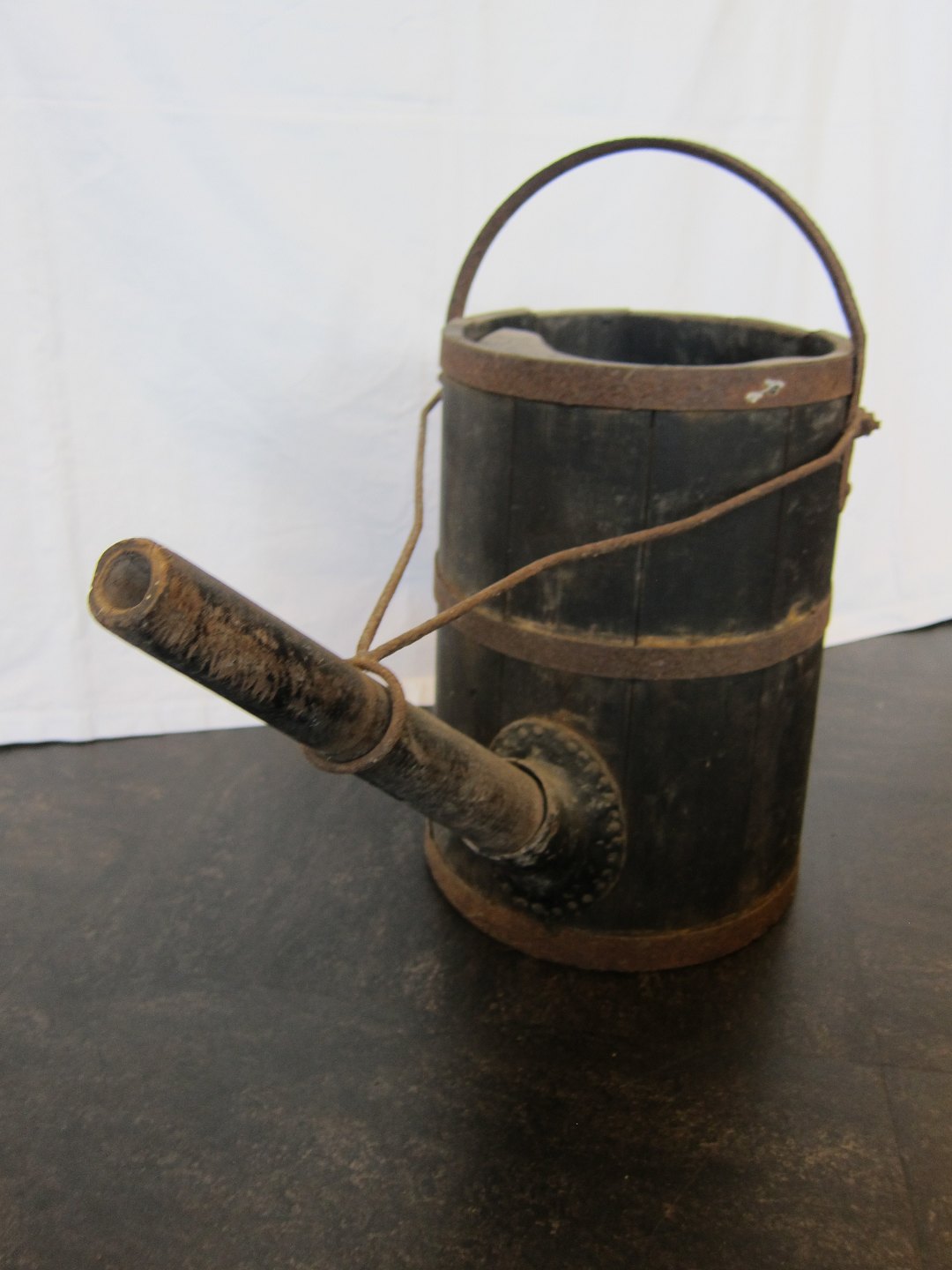 Old watering can made of wood and iron with a long spout