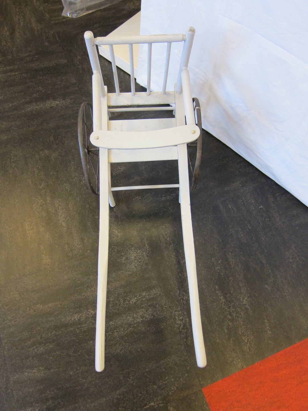 Doll push chair An old doll push chair made of wood and with iron wheels H: 52cm, L: 78cm Articleno.: 411102
