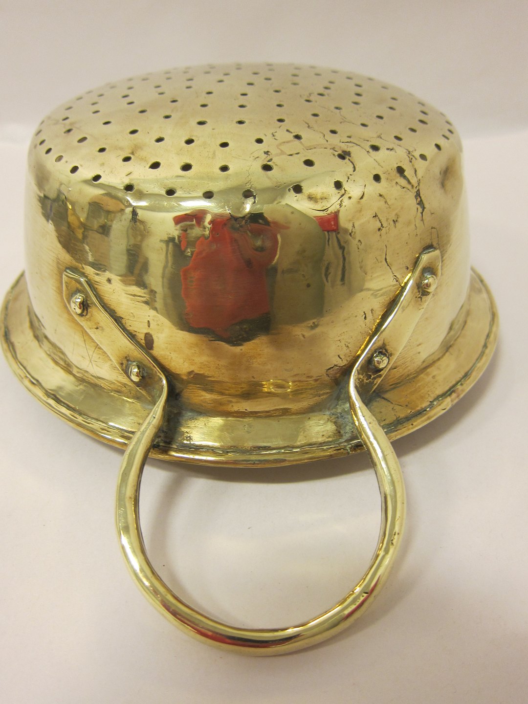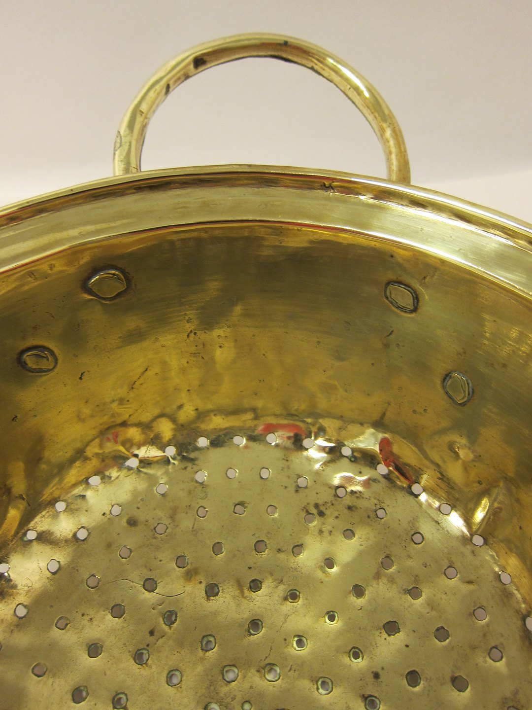 Colander made of brass Antique Colander with 2 beautiful ears About 1840 Diam. inkl. ears: 35cm, excl. ears 23,5cm H: inkl. ears: 13cm, excl. ears 10cm No stamp Please note: Small dent Articleno.: 31641