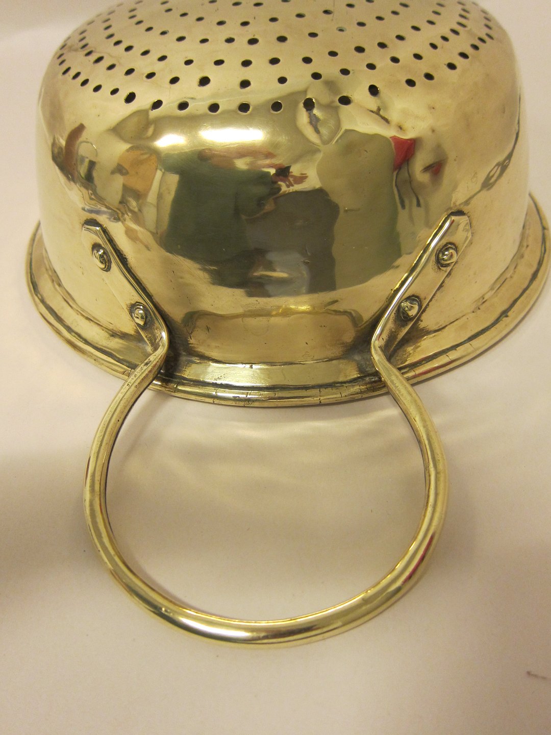 Colander made of brass Antique, big Colander with 2 beautiful ears With stamp Diam. inkl. ears: 45cm, excl. ears 27cm H: 11,5cm Articleno.: 21801