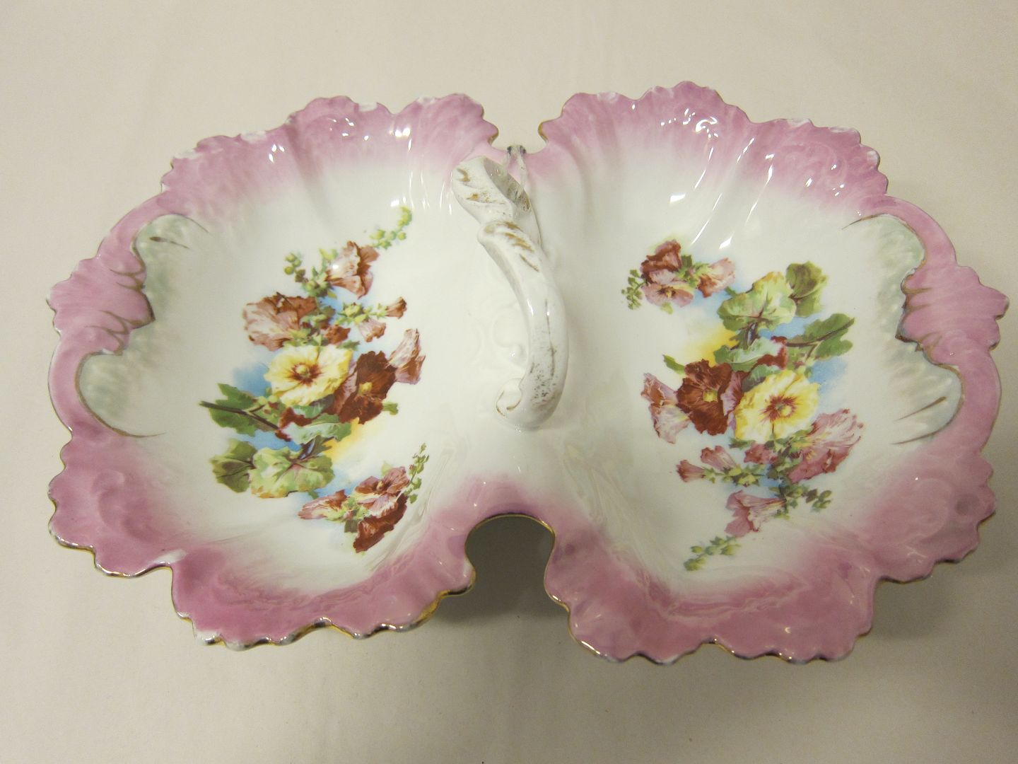 Utrolig dekorativt antikt fad, som er 2-delt med en meget smukt formet hank. Se de smukke dekorationer.