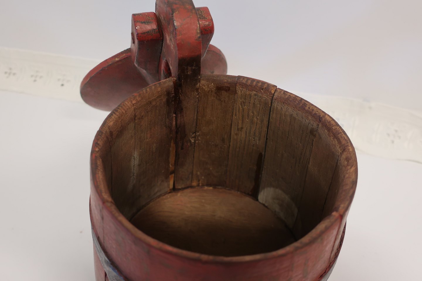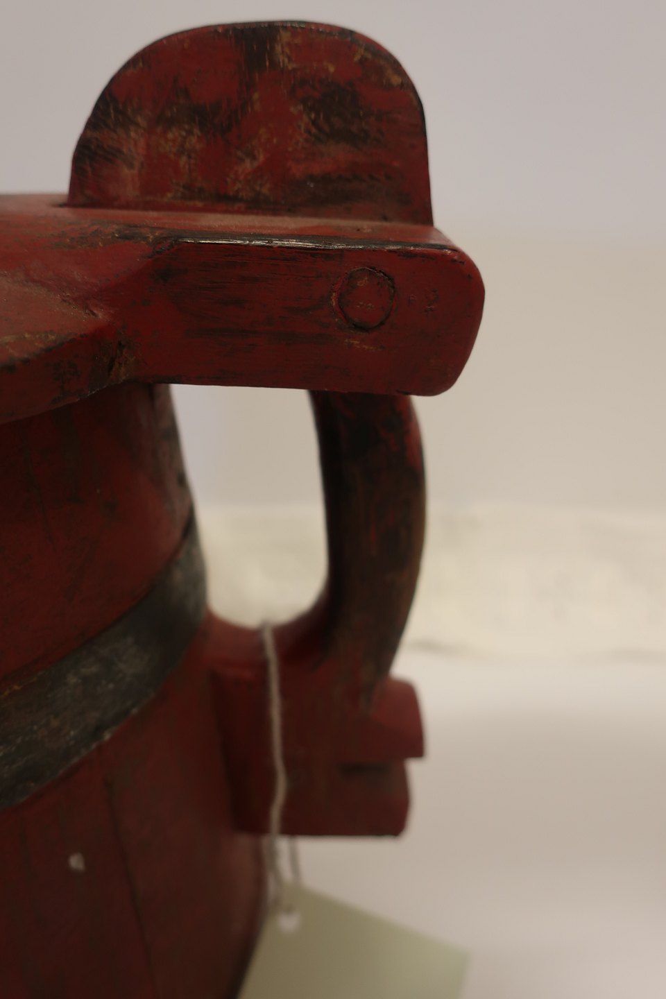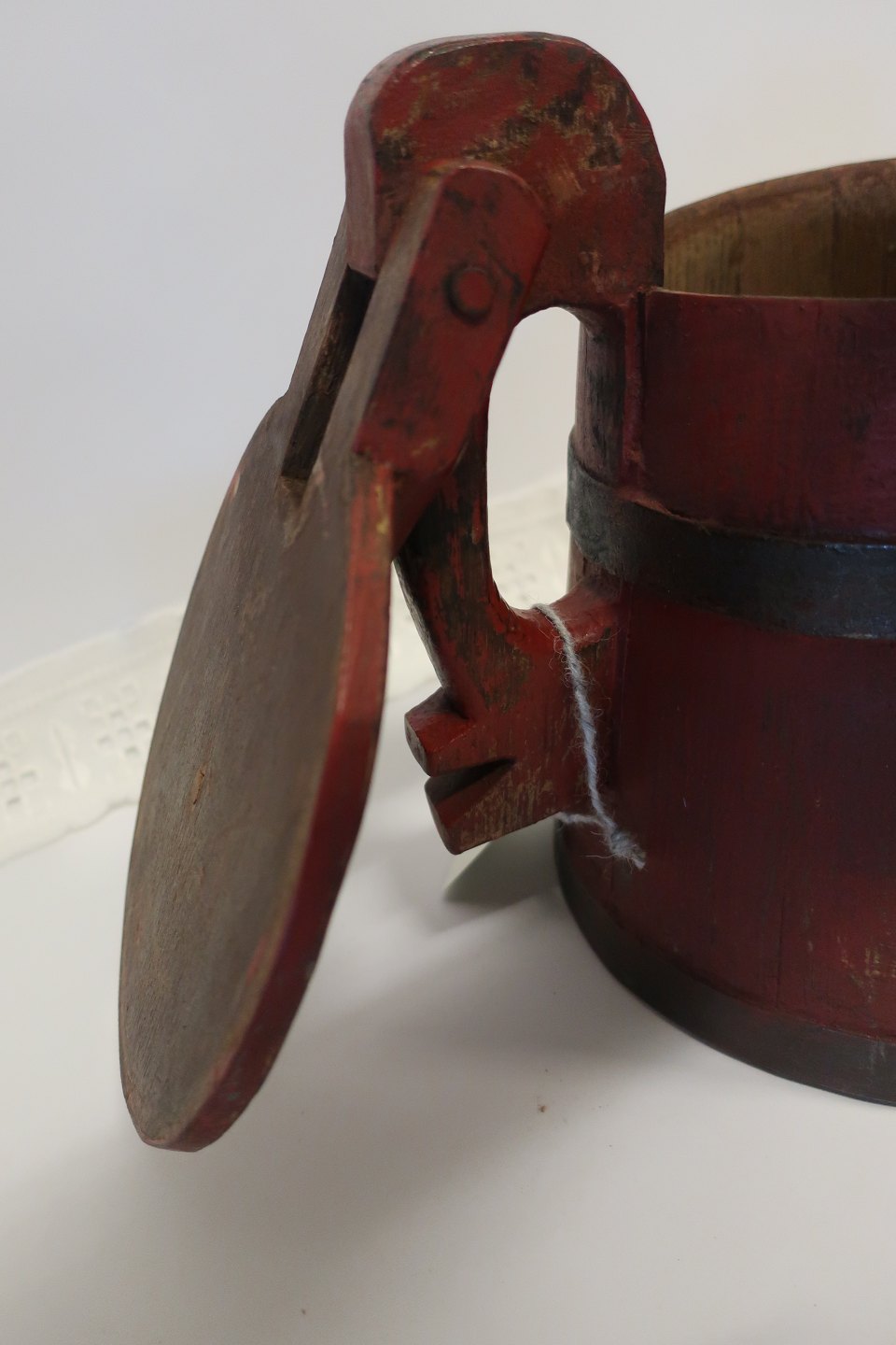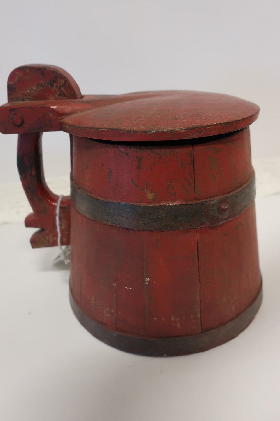 Antik ølkande i træ fra Nordfyn Med jernbånd Fra 1800-tallet H: ca. 23,5cm ved højeste sted (hank) Diam: ca. 23cm for selve kanden Meget flot stand Varenr.: 411171