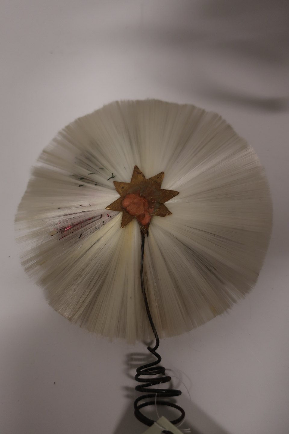 Denne gamle julepynt er lavet af englehår samt glansbilleder/papir mv.