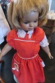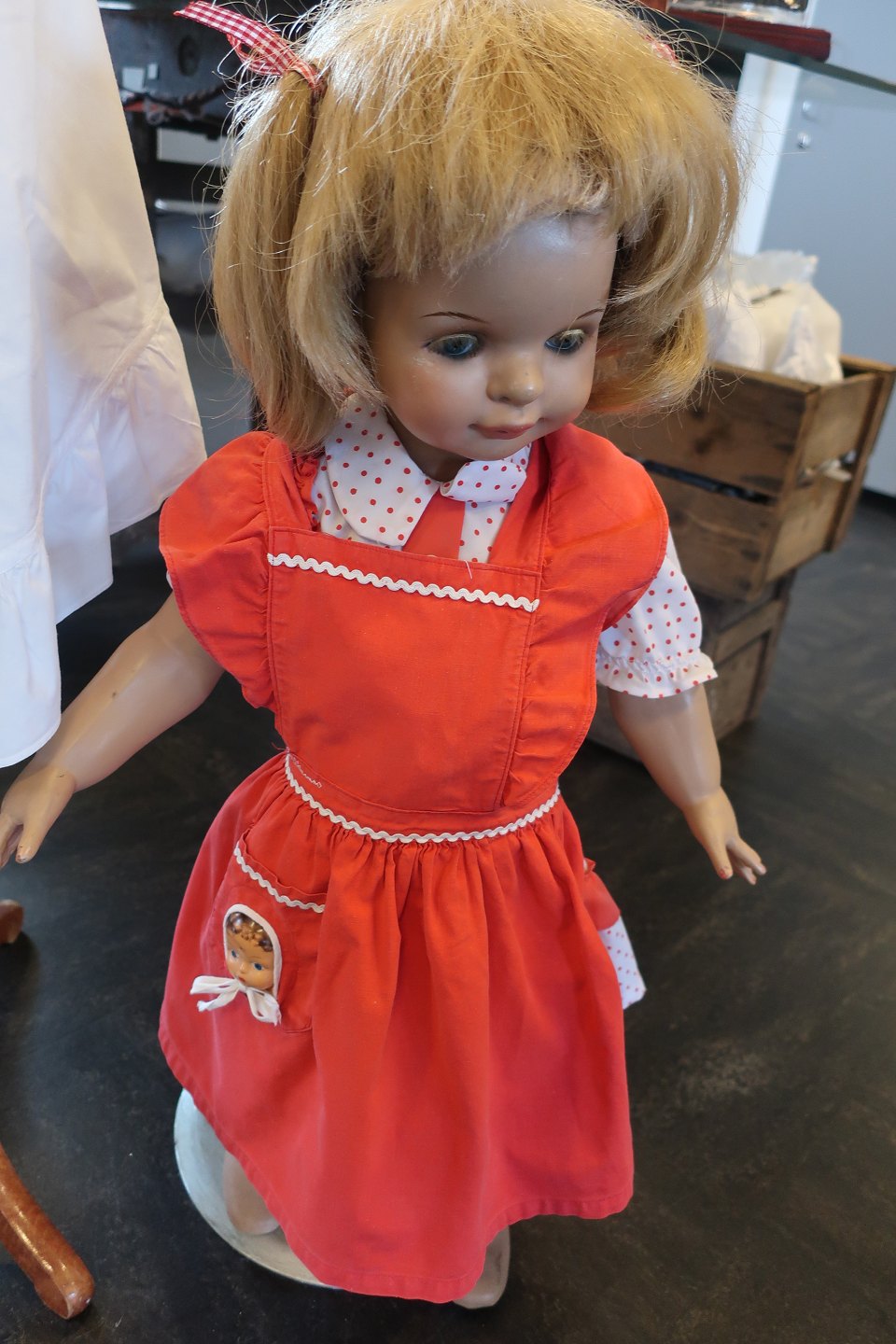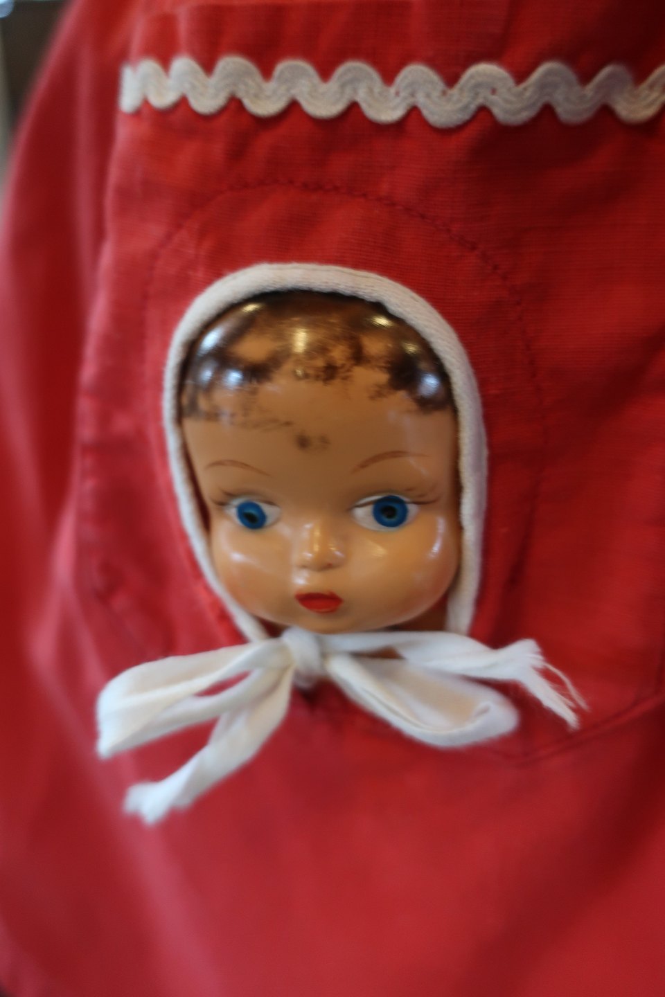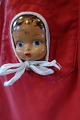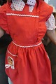This is a very special pinafore, where a doll face is placed in a cavity/hole at the pocket. It is possible to take the face out/move the face away when the pinafore is to be washed