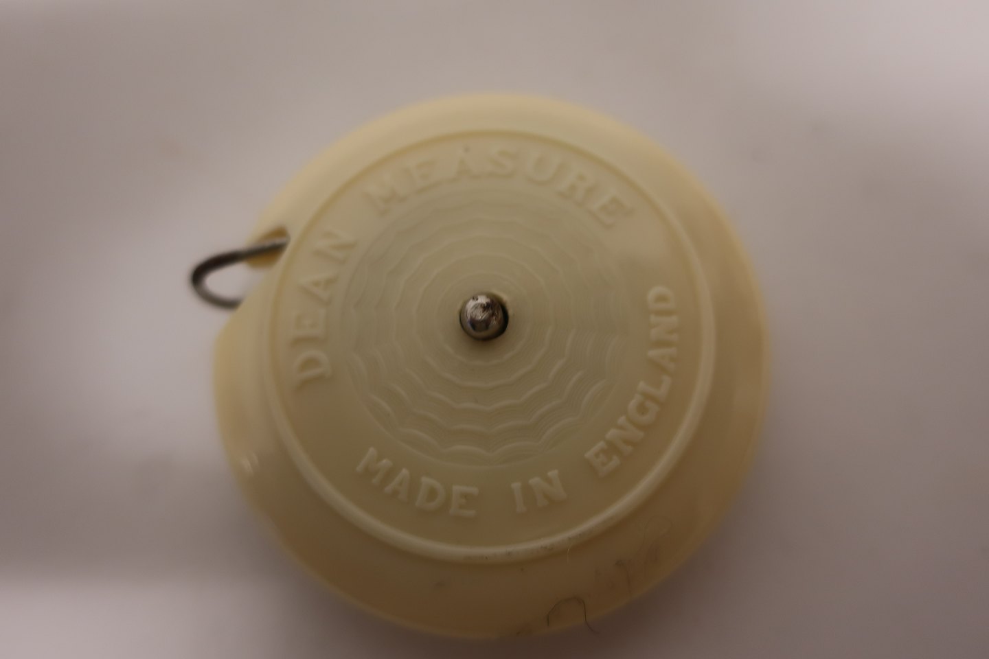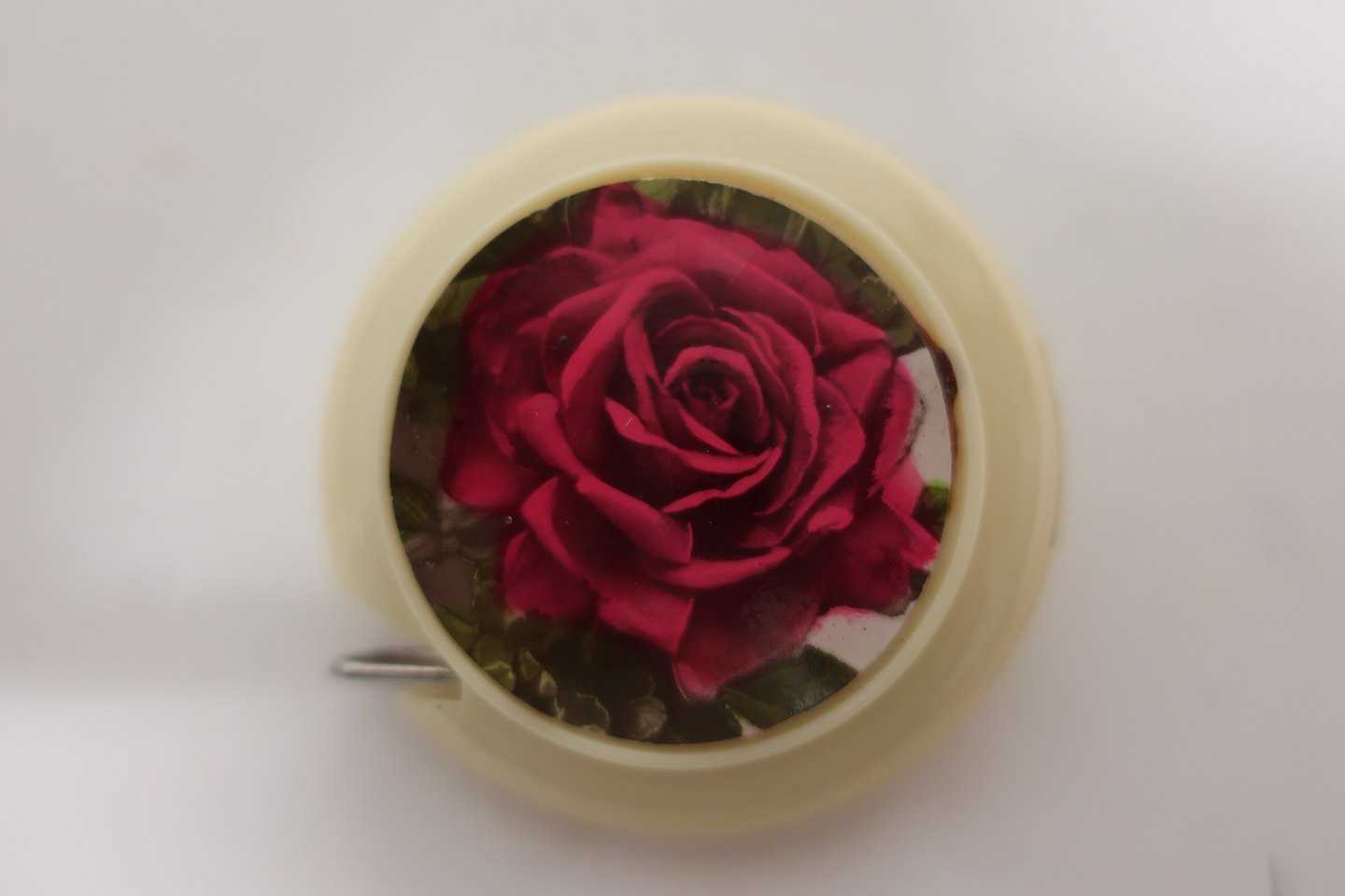 Målebånd i en runde holder, prydet med en rose, målebåndet trækkes ud