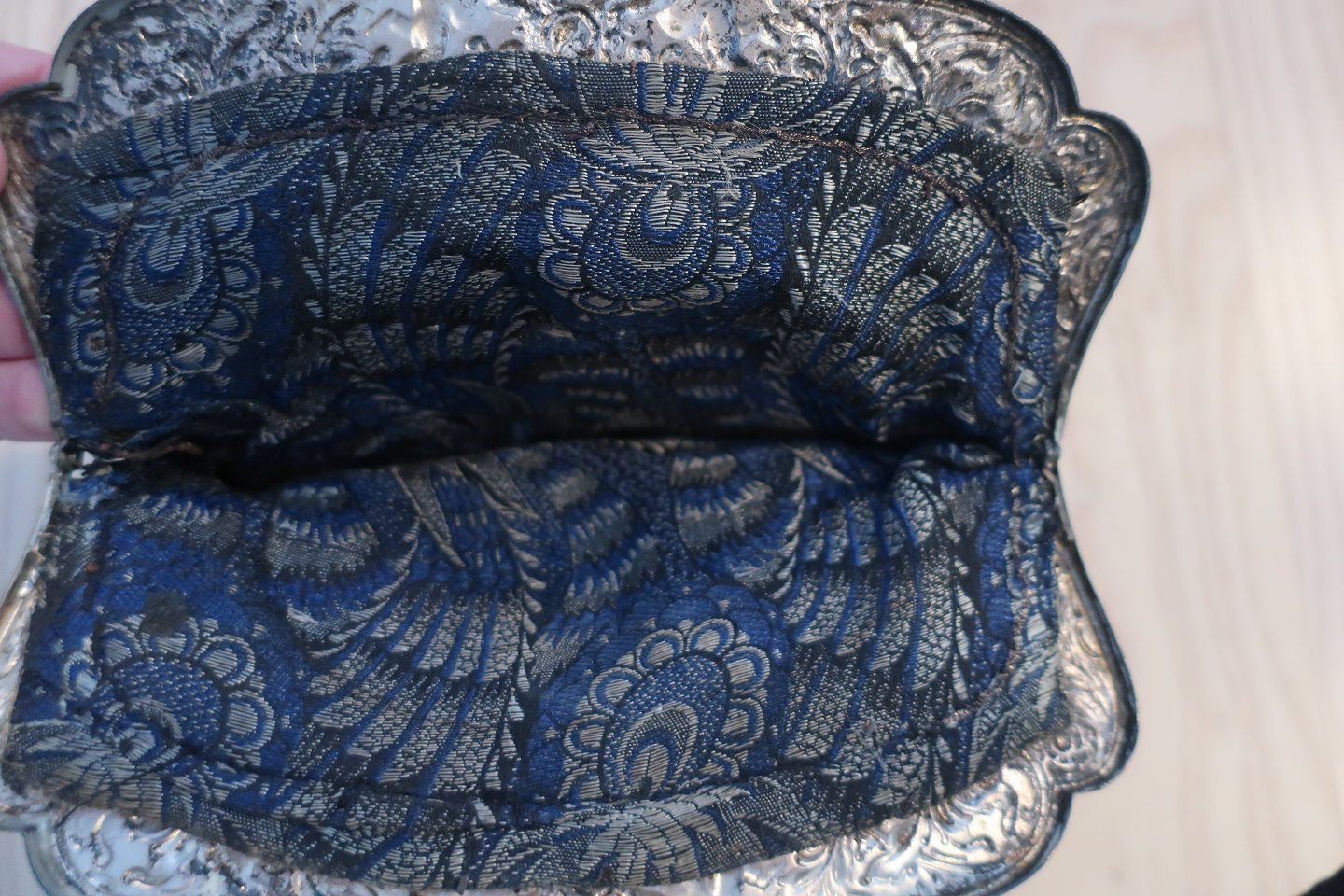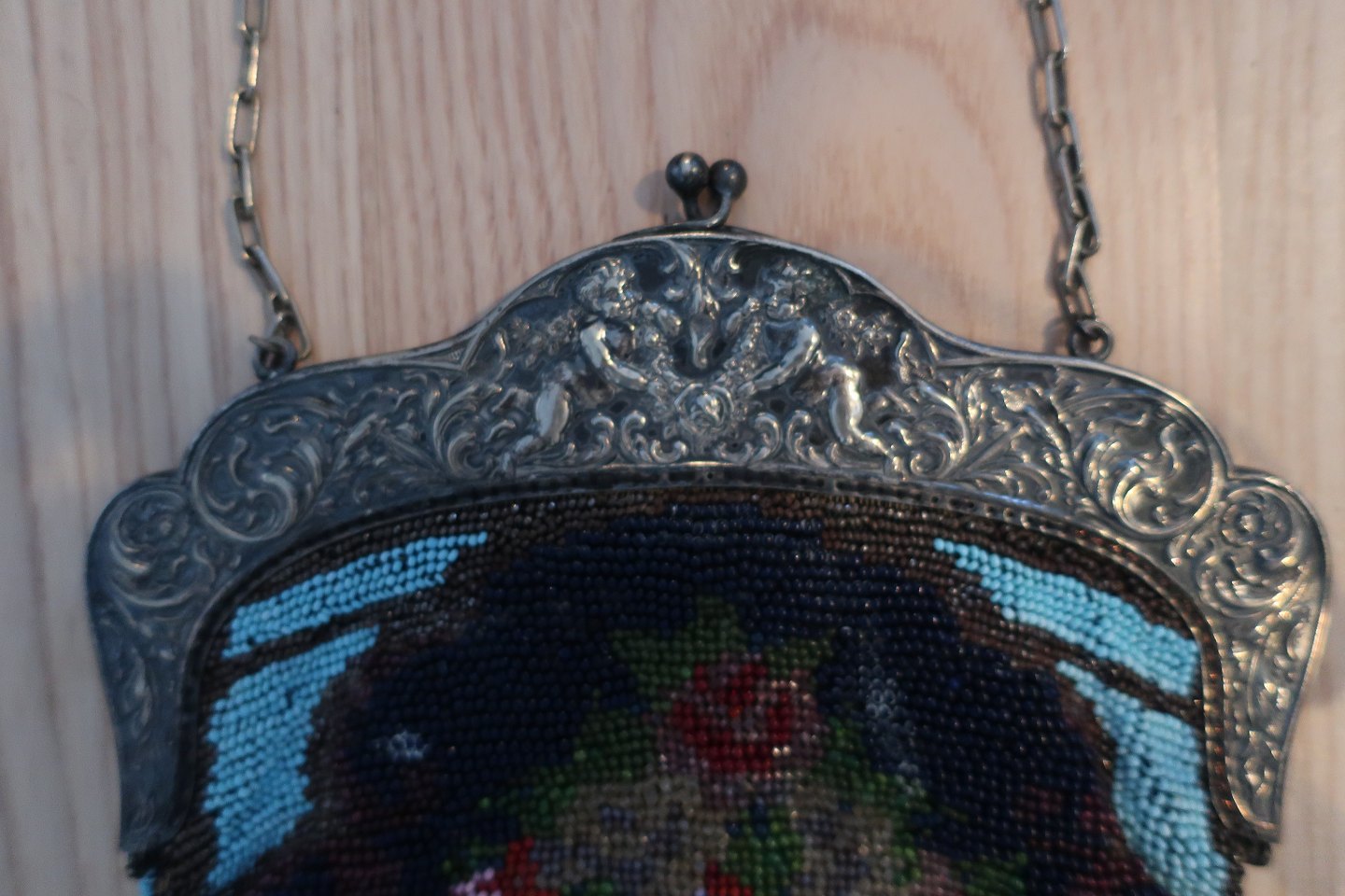 This beautiful old handmade bag, from about 1880, is handmade of glass beads with embroidery which shows creative figures