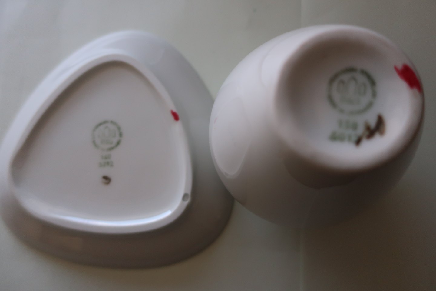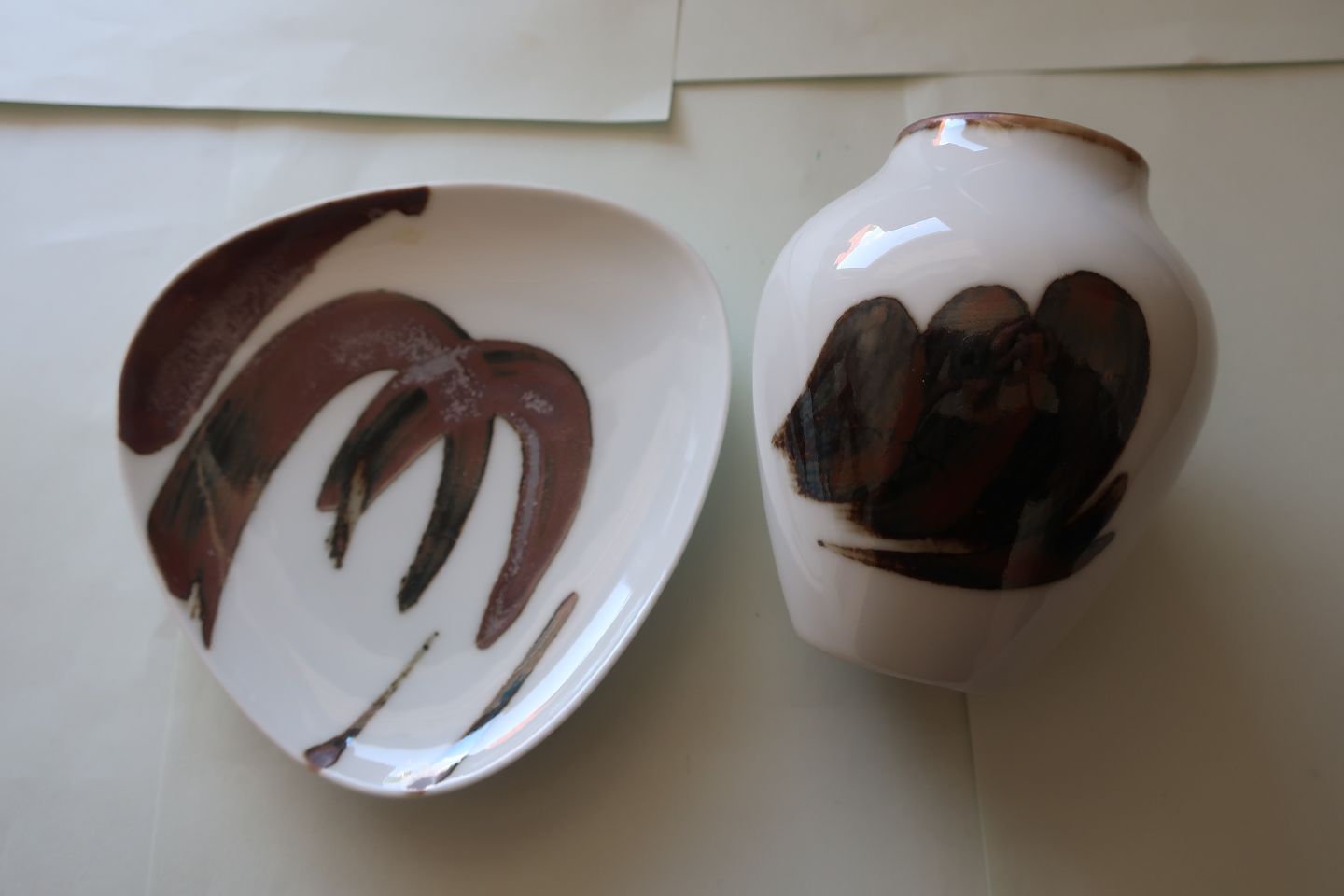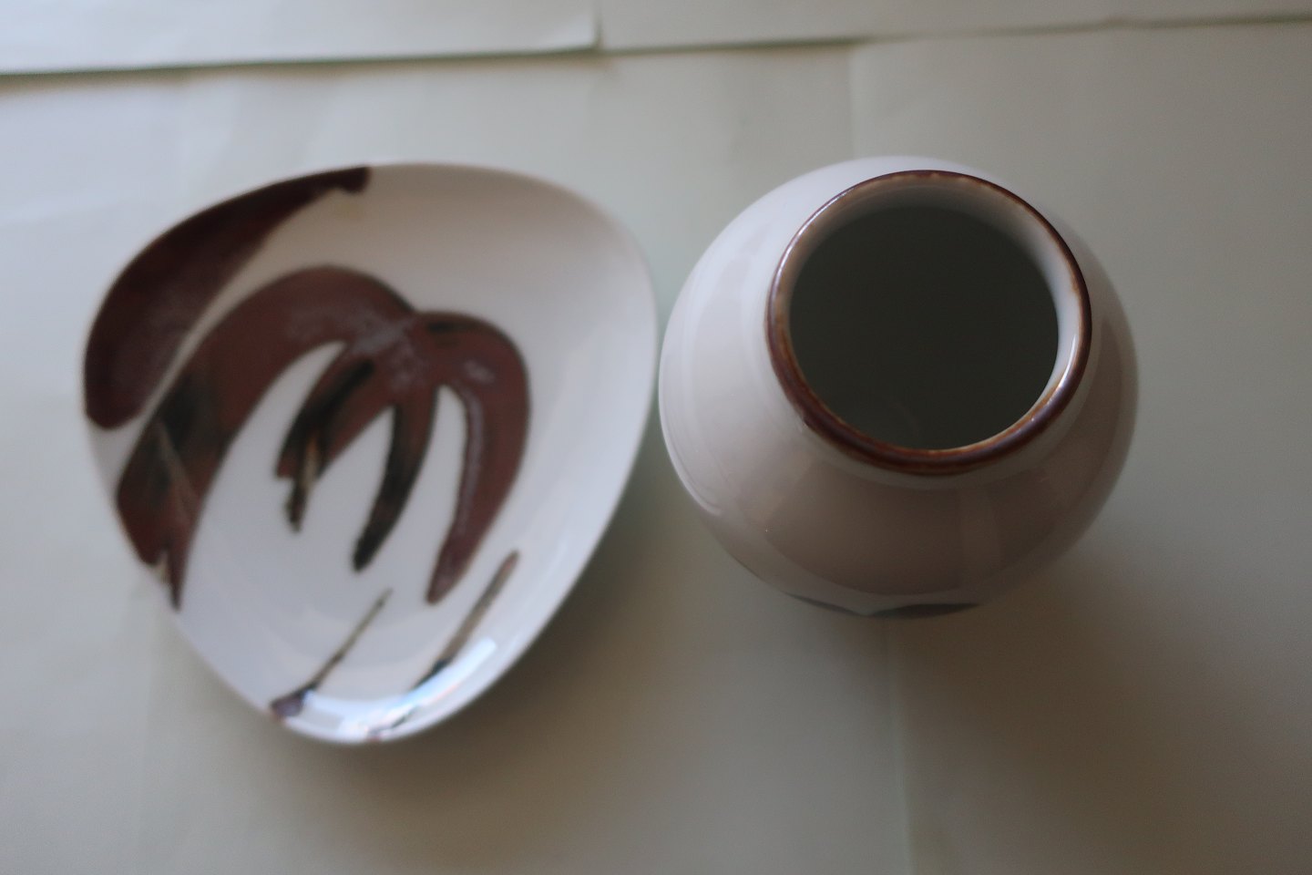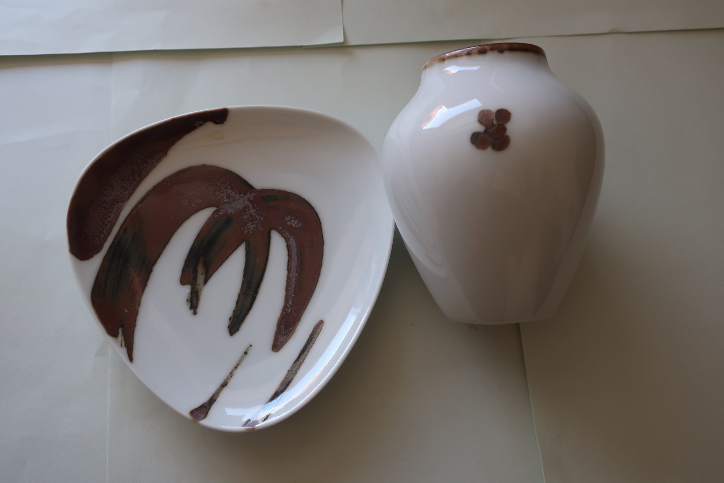 Bing & Grøndahl (B&G), Denmark Set with a little vase and a little plate Art Nouveau Model: 158/5012 and 160/5292 1. Grade H: 10cm (vase) B: 12cm (little plate) In a good condition Articleno.: KM1005