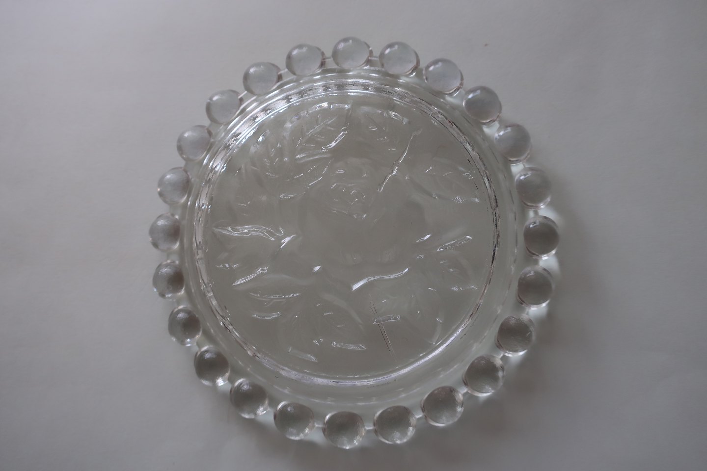 Alte coasters made of glass With beautiful decorations of a rose etc. Diam: 10,5cm From the 1930'years Is sold as a set of 2 items In a good condition Articleno.: KM1006