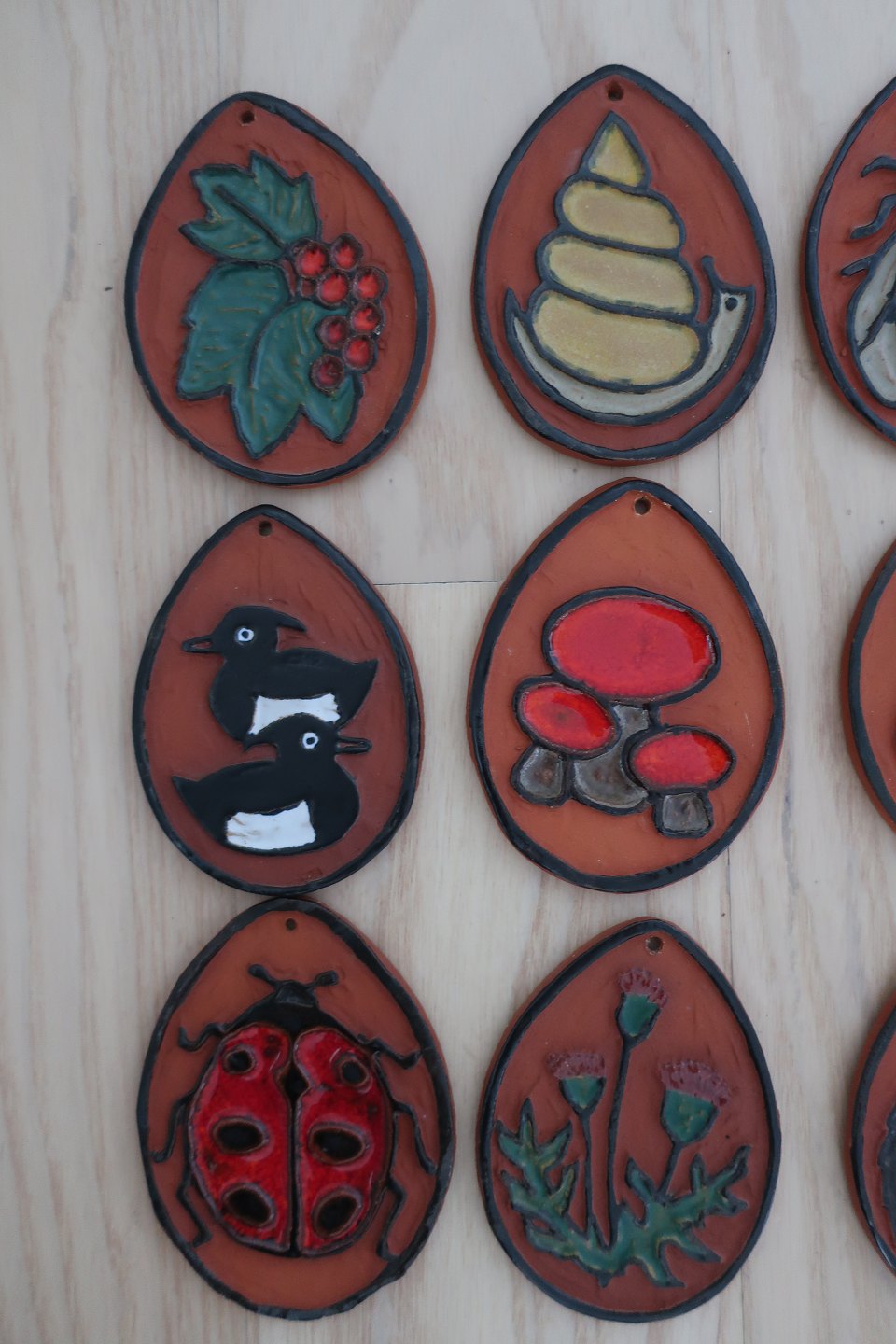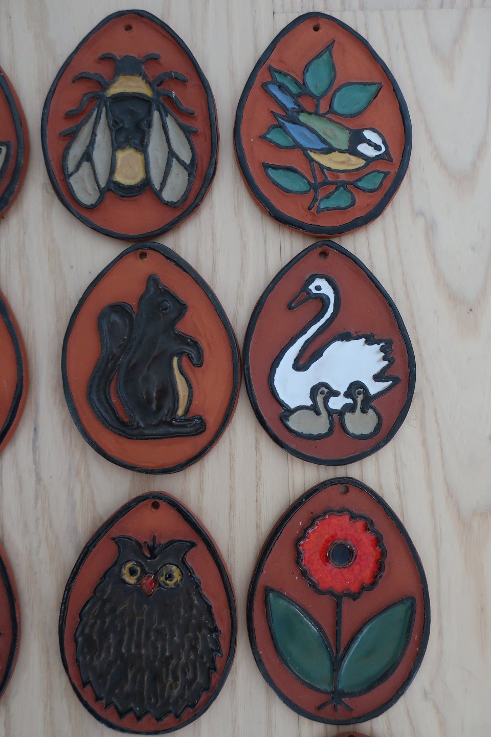 Sjældne motiver af Dråbe-Keramik af Hildegon den kendte keramiker fra Als i Sønderjylland. Dråberne blev udført med mange forskellige motiver.
